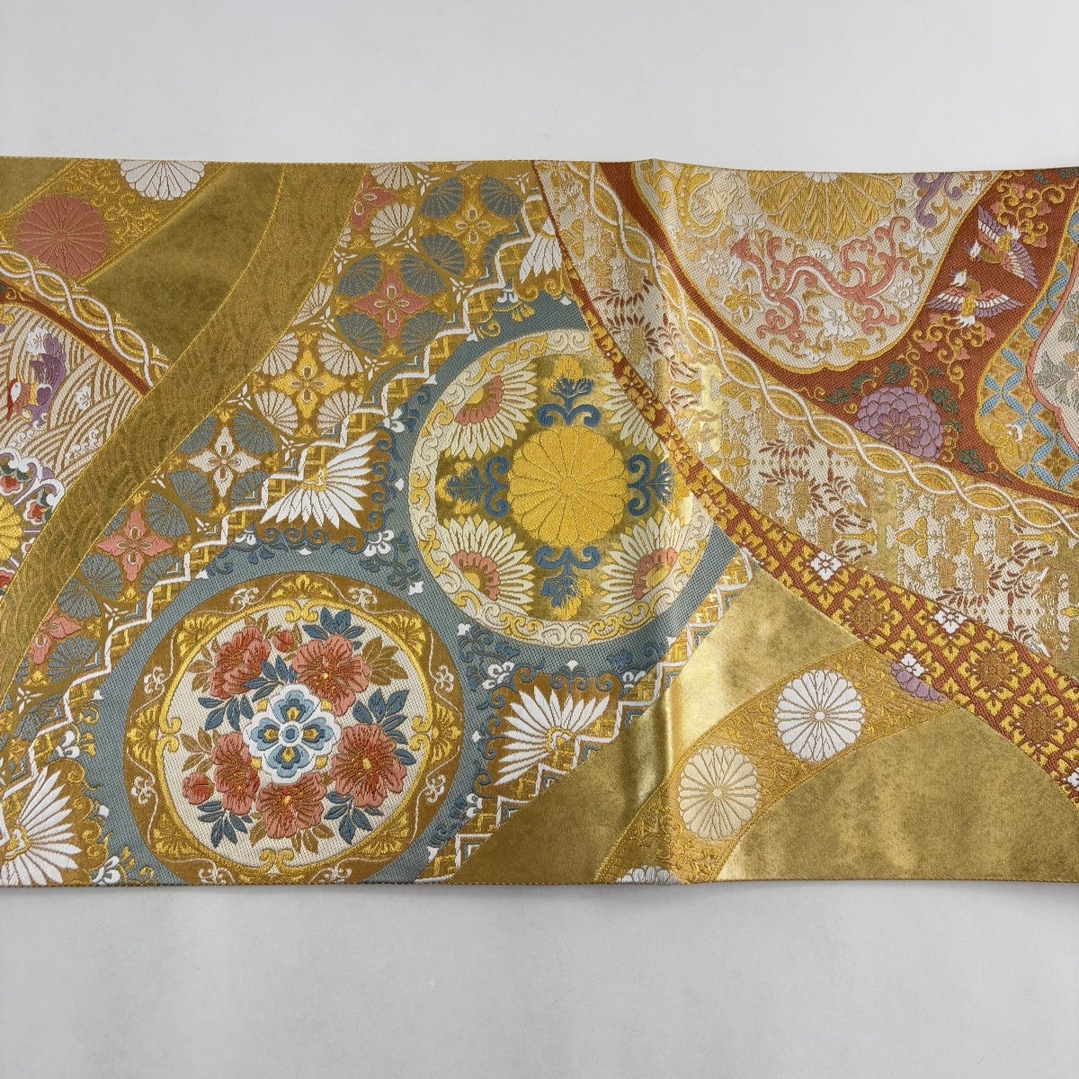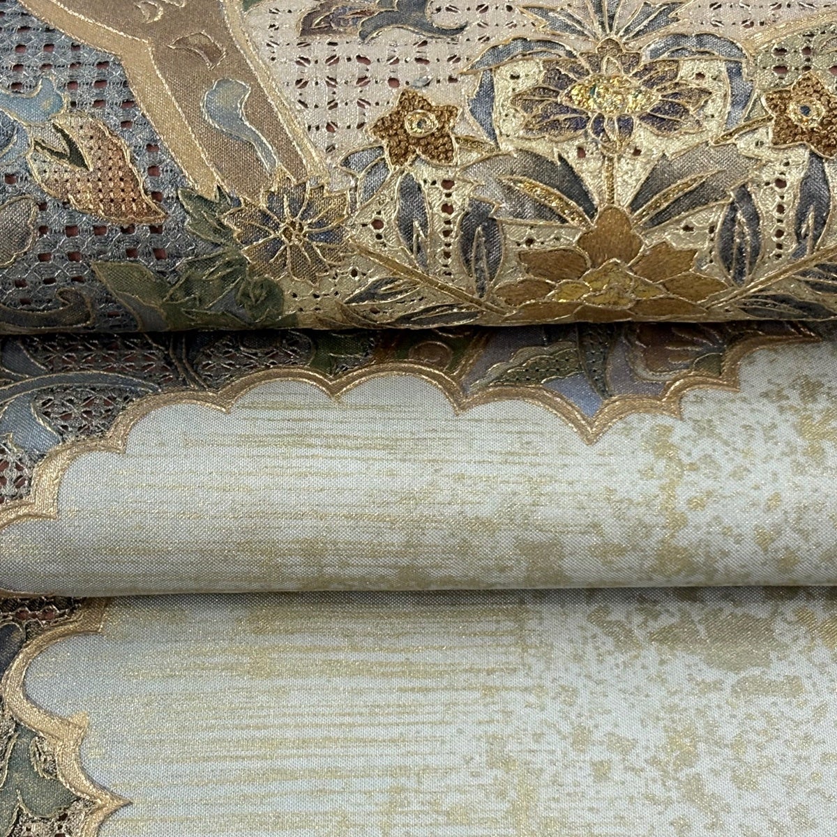 【美品】 袋帯 秀品 華文 組紐 金銀糸 箔 ベージュ 六通 正絹