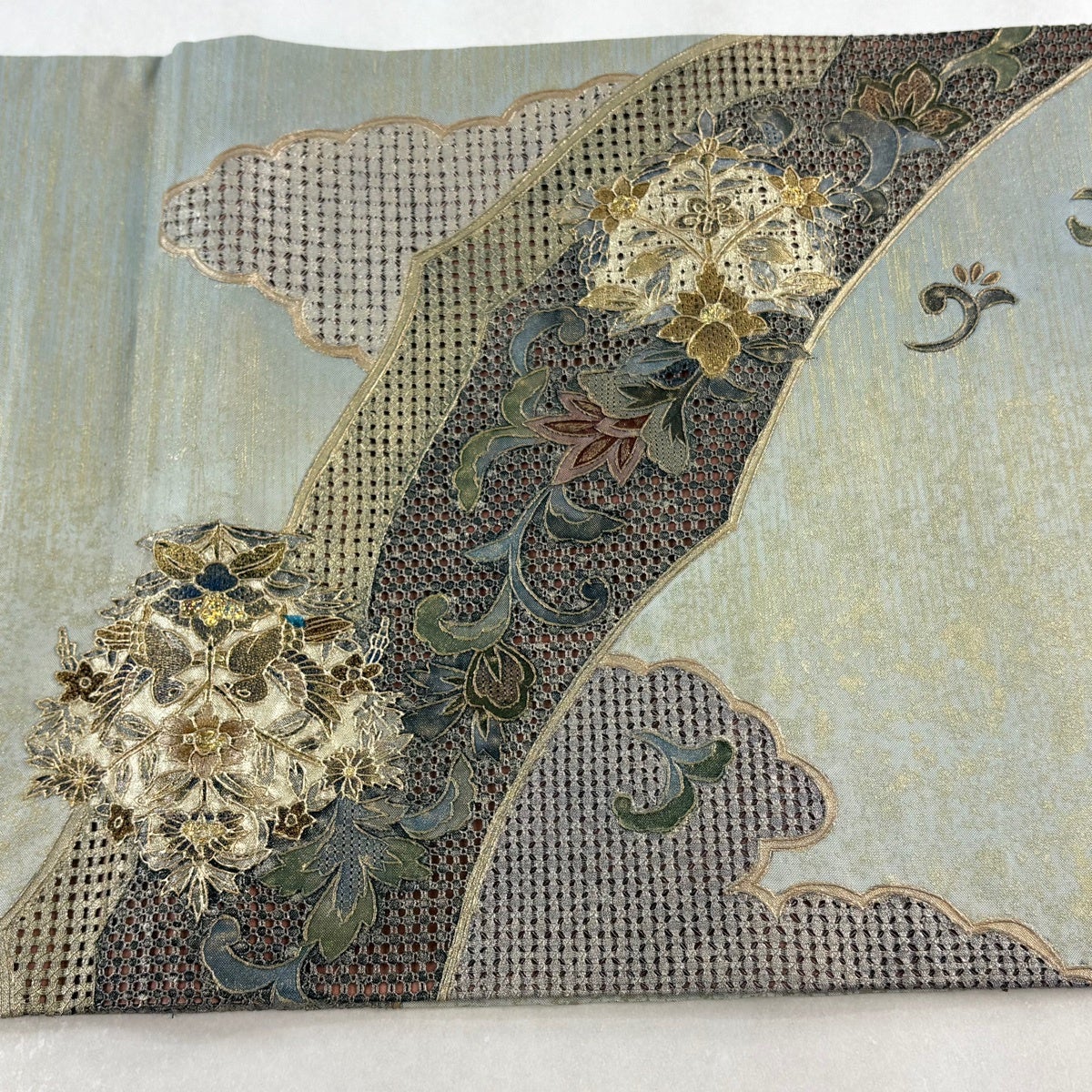 【美品】 袋帯 秀品 夏帯 縦絽 枝花 ぼかし 青灰色 お太鼓柄 正絹