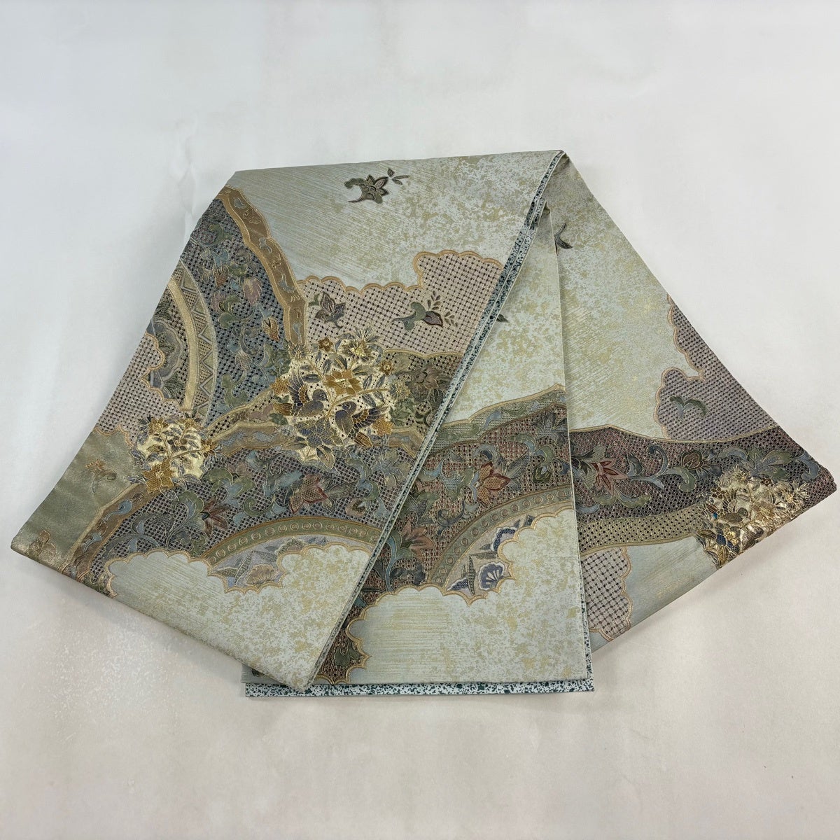 【美品】 袋帯 秀品 関西仕立て 吉祥絵図 箔 金糸 灰白 六通 正絹