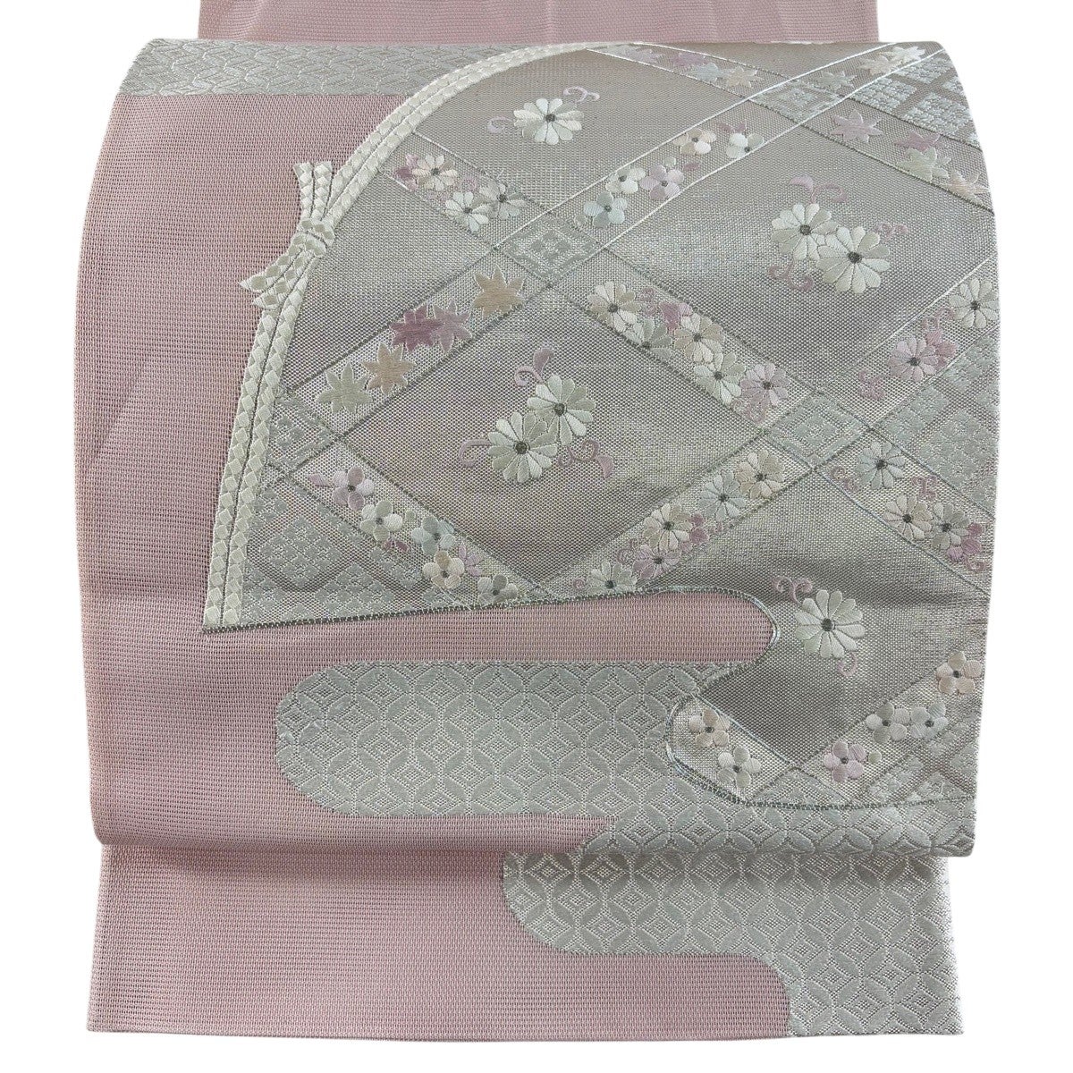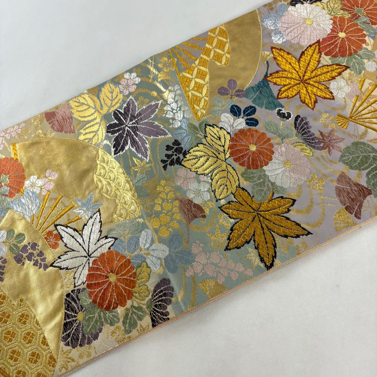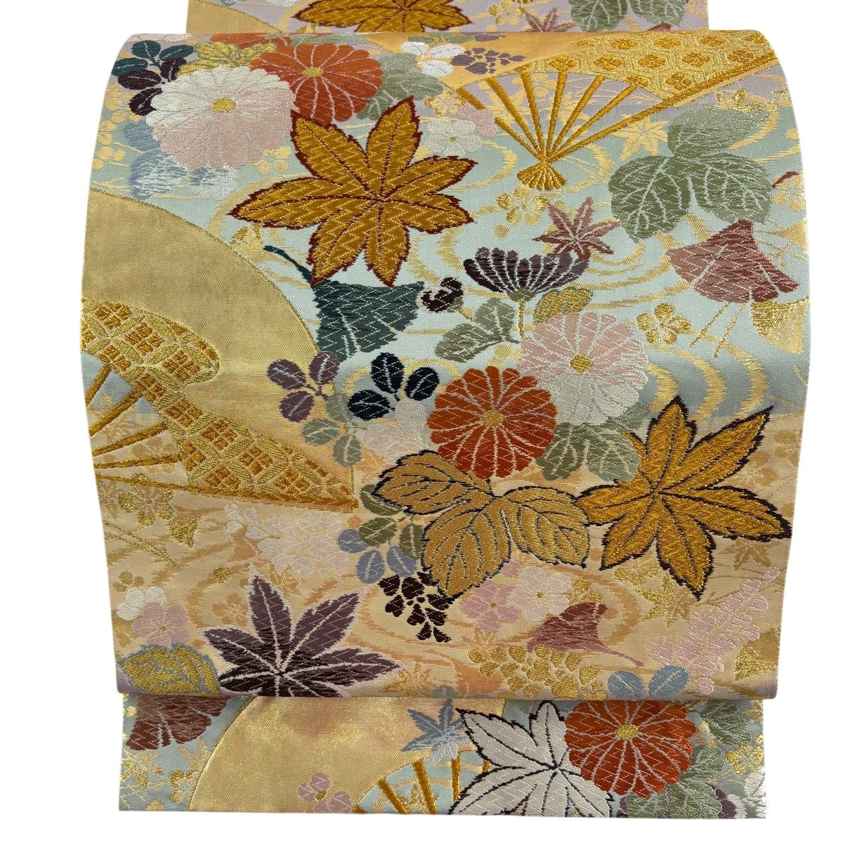 袋帯 秀品 夏帯 絽 扇面 秋草 金銀糸 箔 ベージュ 六通 正絹