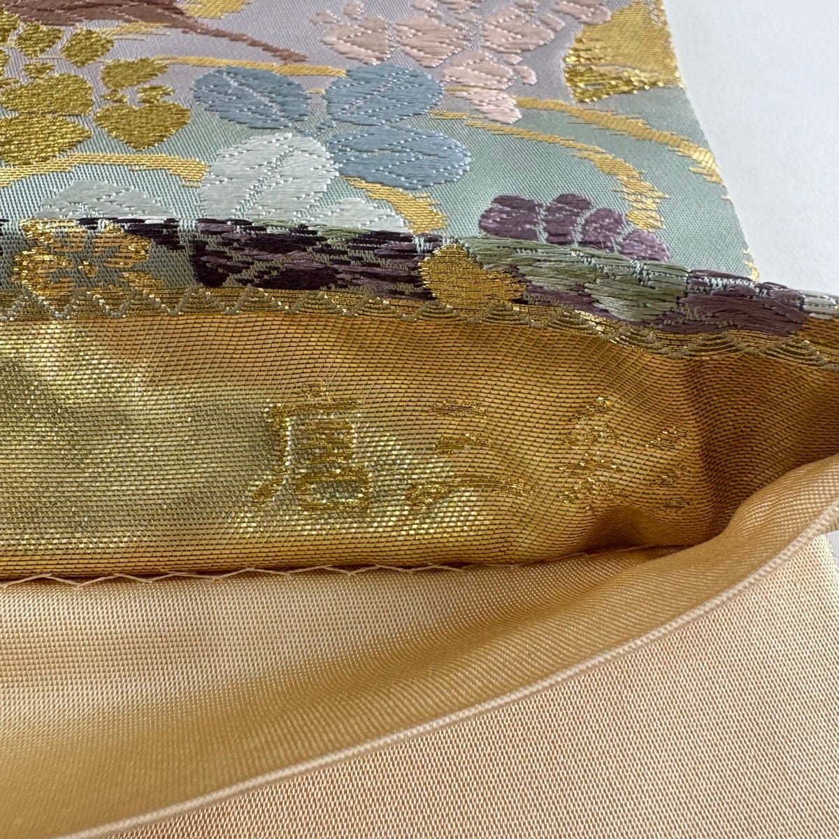 袋帯 逸品 龍村晋 落款あり 天平猟獣文錦 金糸 箔 薄緑 全通 正絹