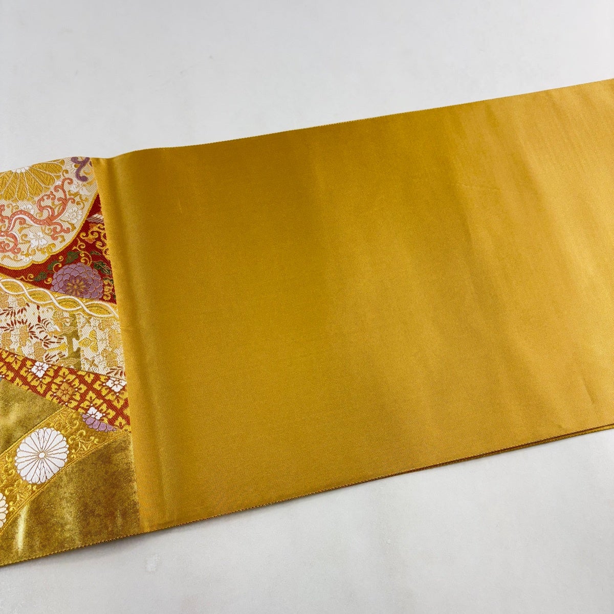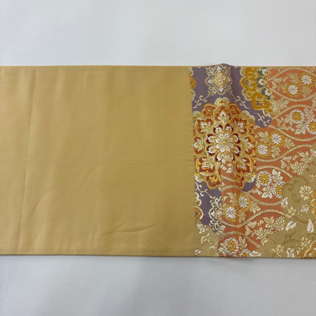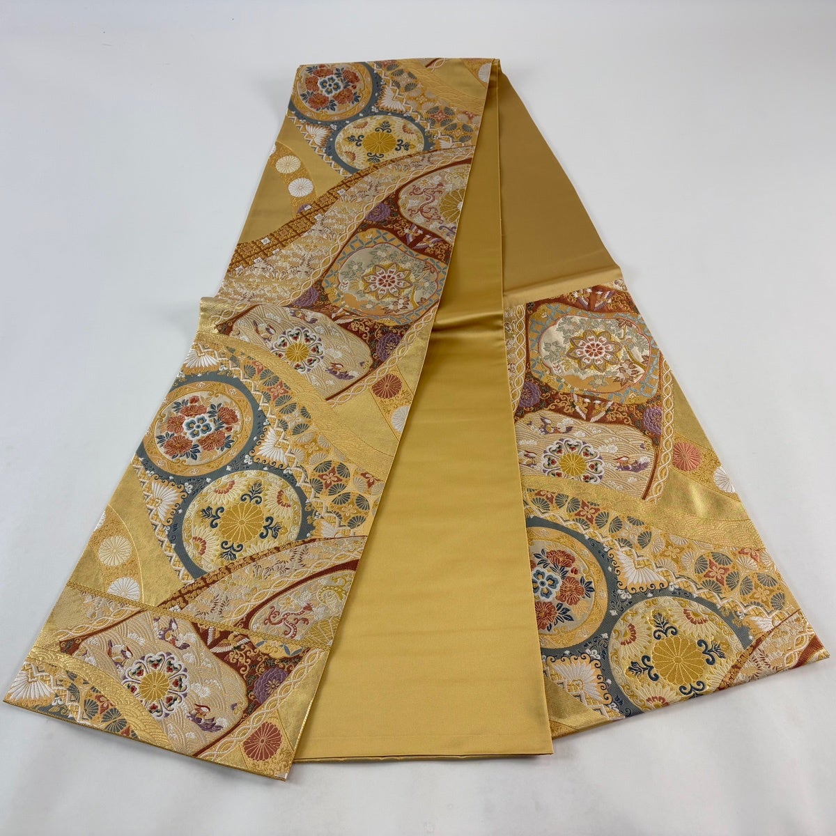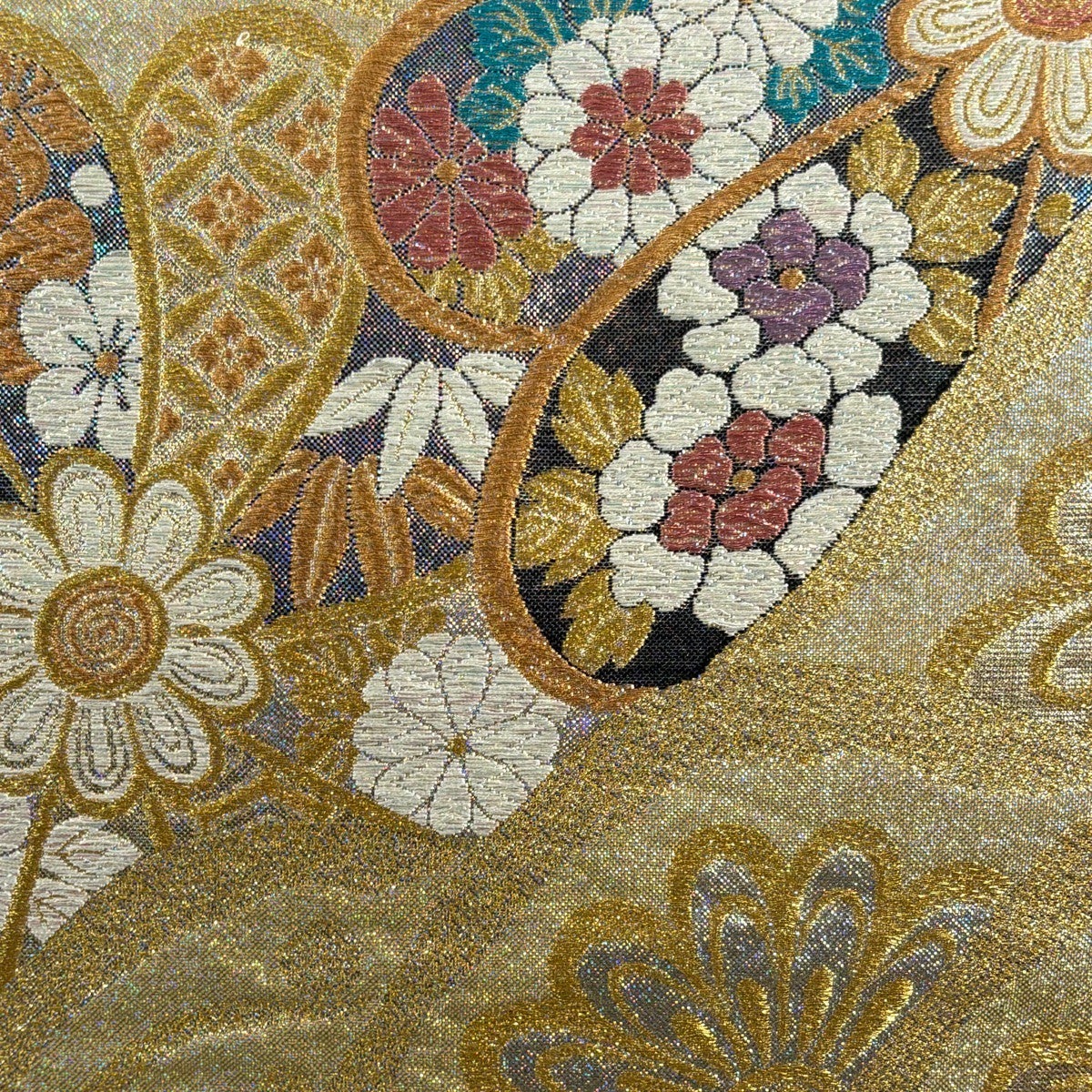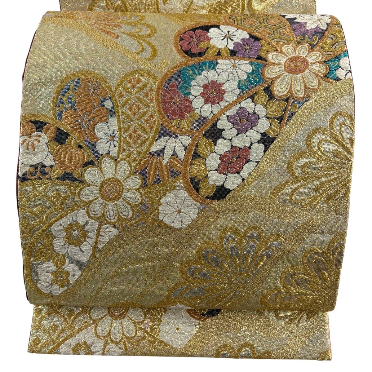 【美品】 袋帯 秀品 御所車 草花 金糸 箔 ベージュ 全通 正絹
