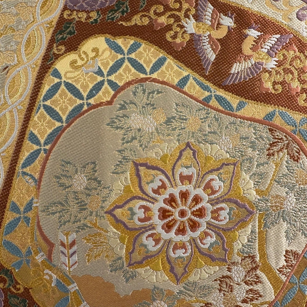 【美品】 袋帯 秀品 向い鳥 華文 金糸 箔 ベージュ 六通 正絹