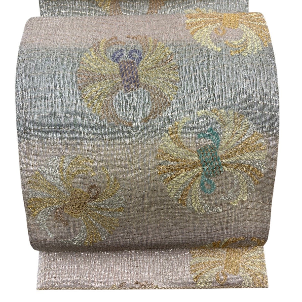 【美品】 袋帯 逸品 証紙あり はたおり娘 牡丹 桔梗 薄緑 全通 正絹