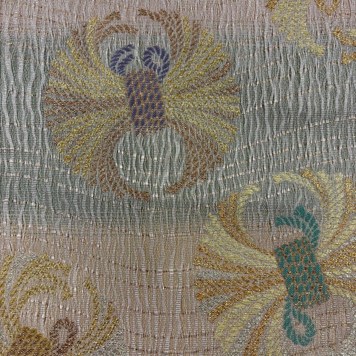 【美品】 袋帯 逸品 華文 草花 相良刺繍 金糸 青灰色 お太鼓柄 正絹