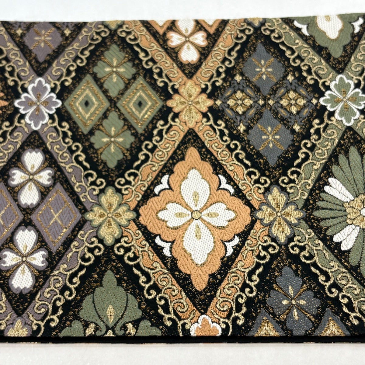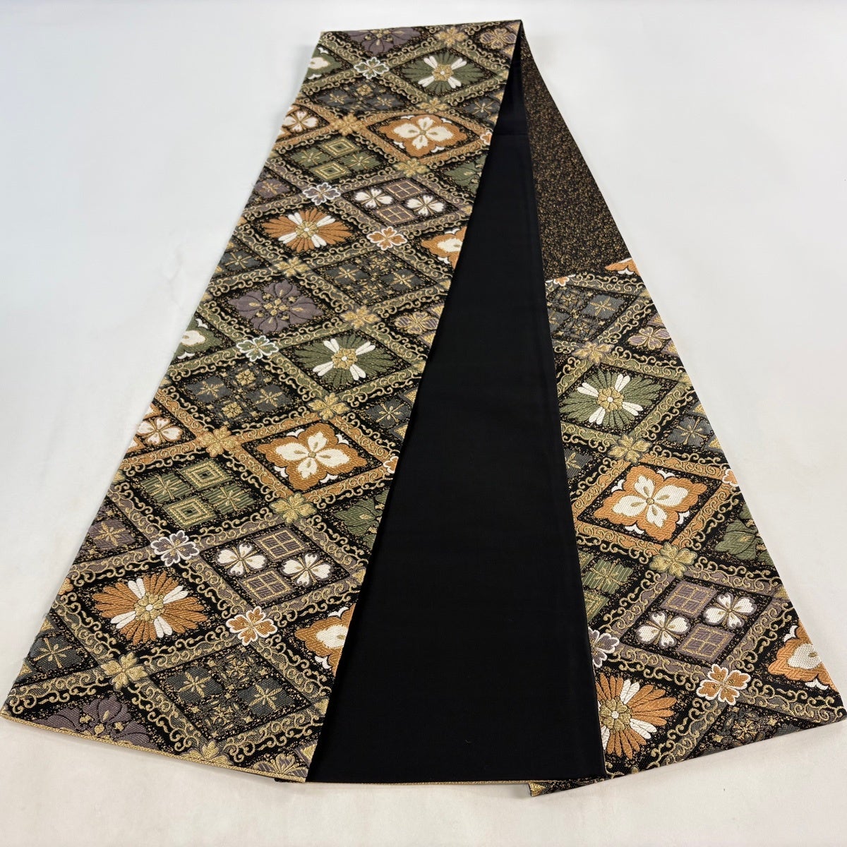 袋帯 名品 華文 菱 金糸 刺繍 黒 六通 正絹