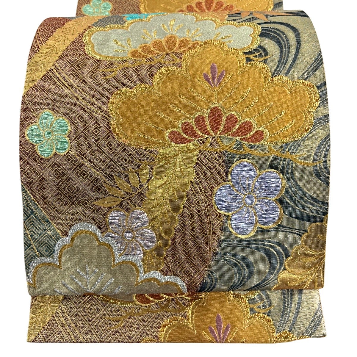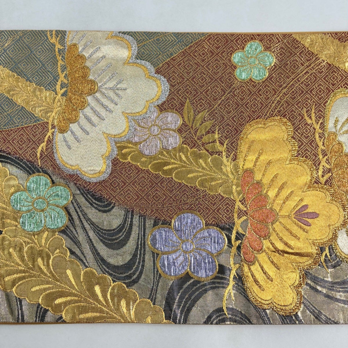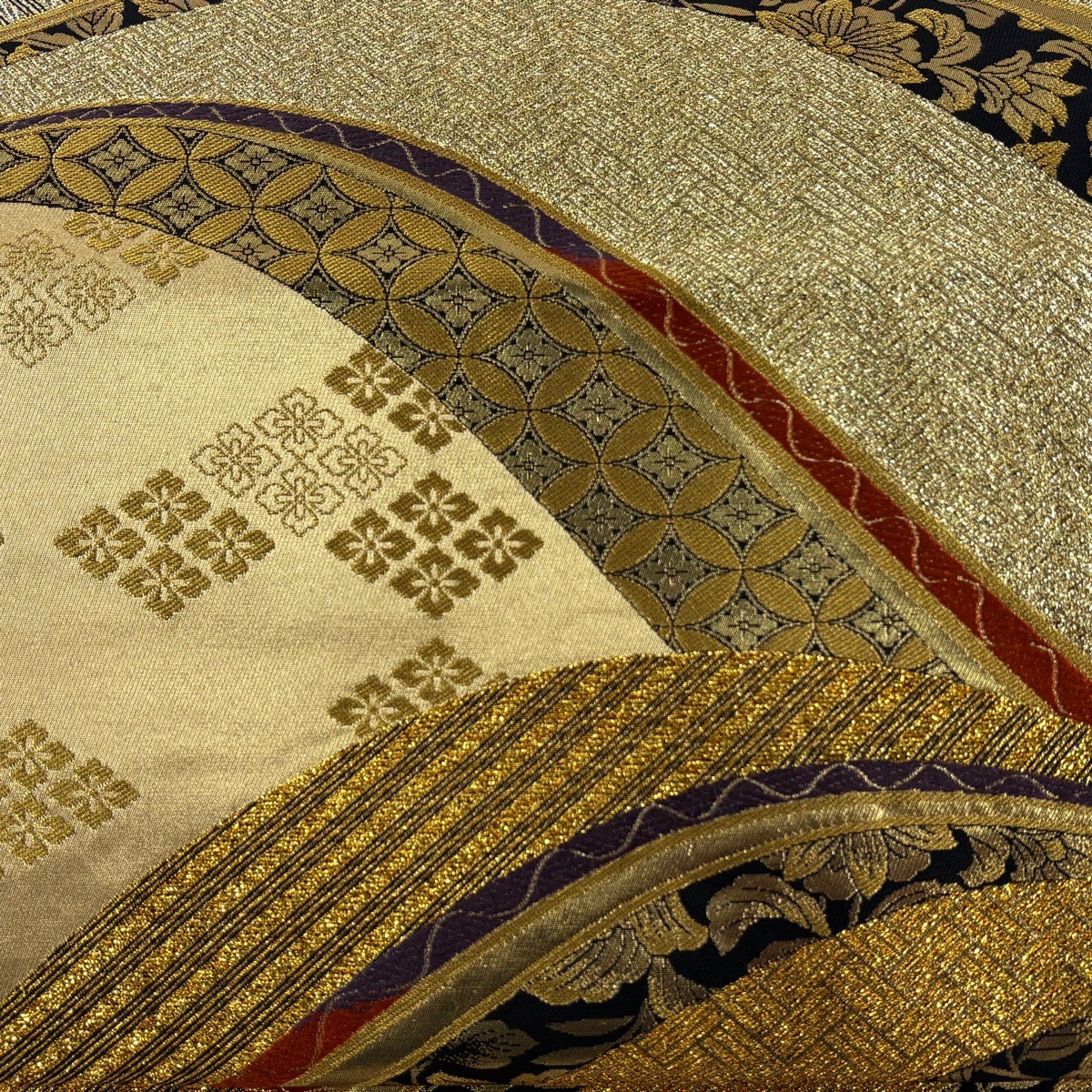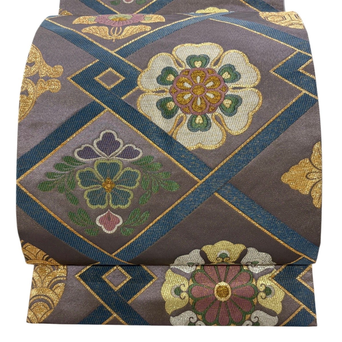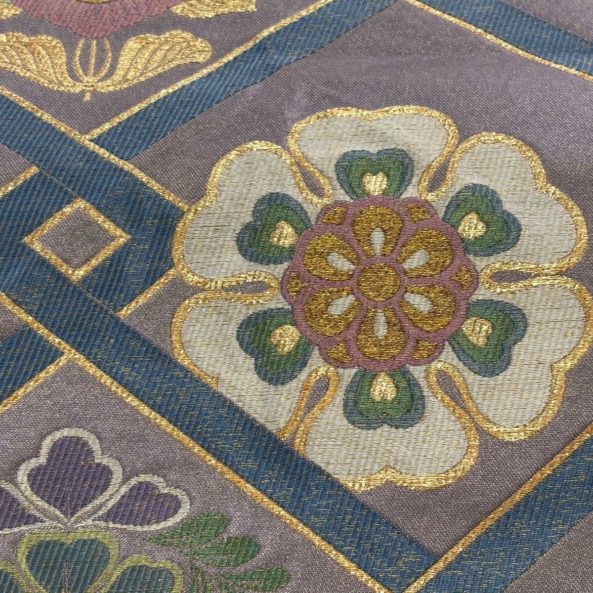 袋帯 名品 華文 菱 金糸 箔 茶紫 六通 正絹