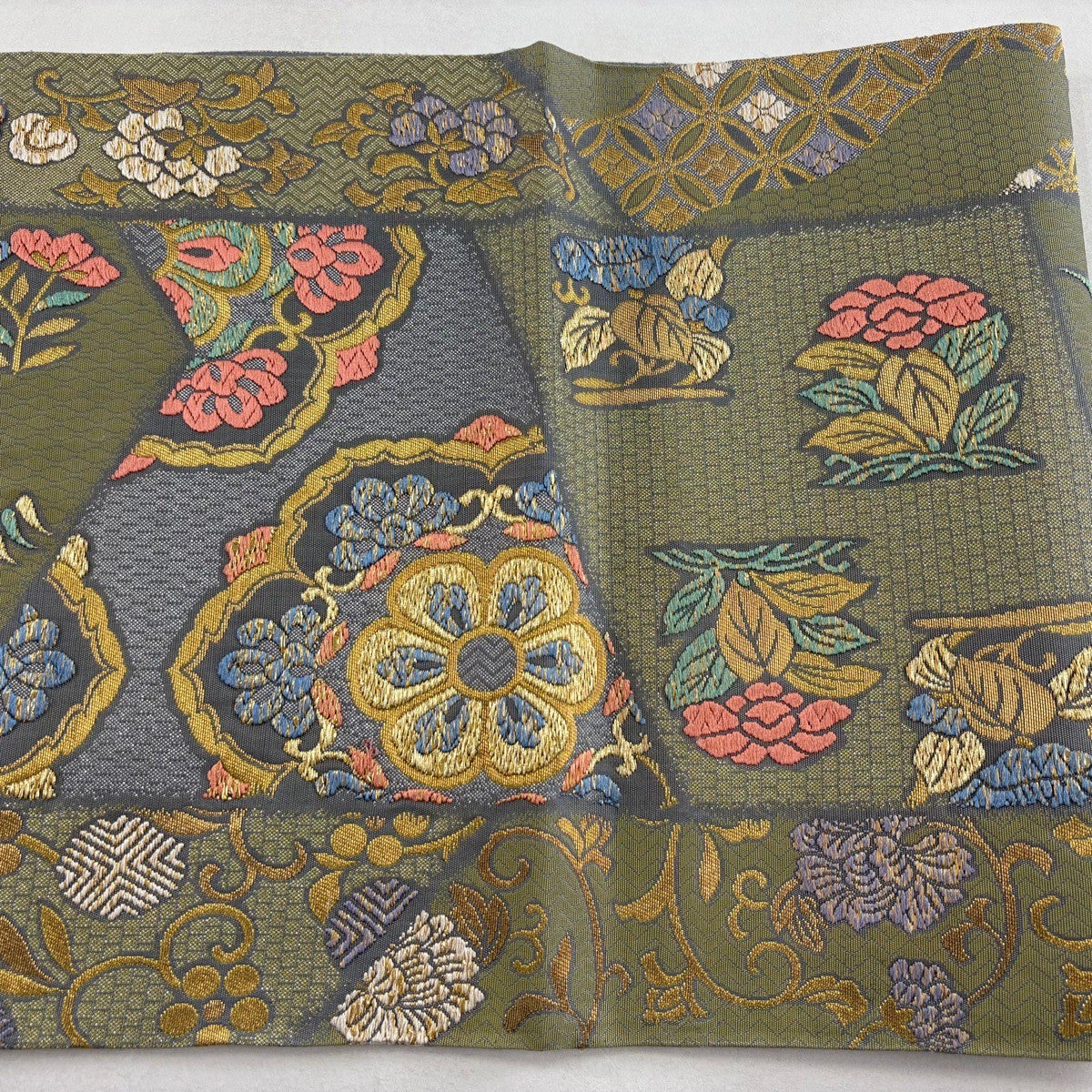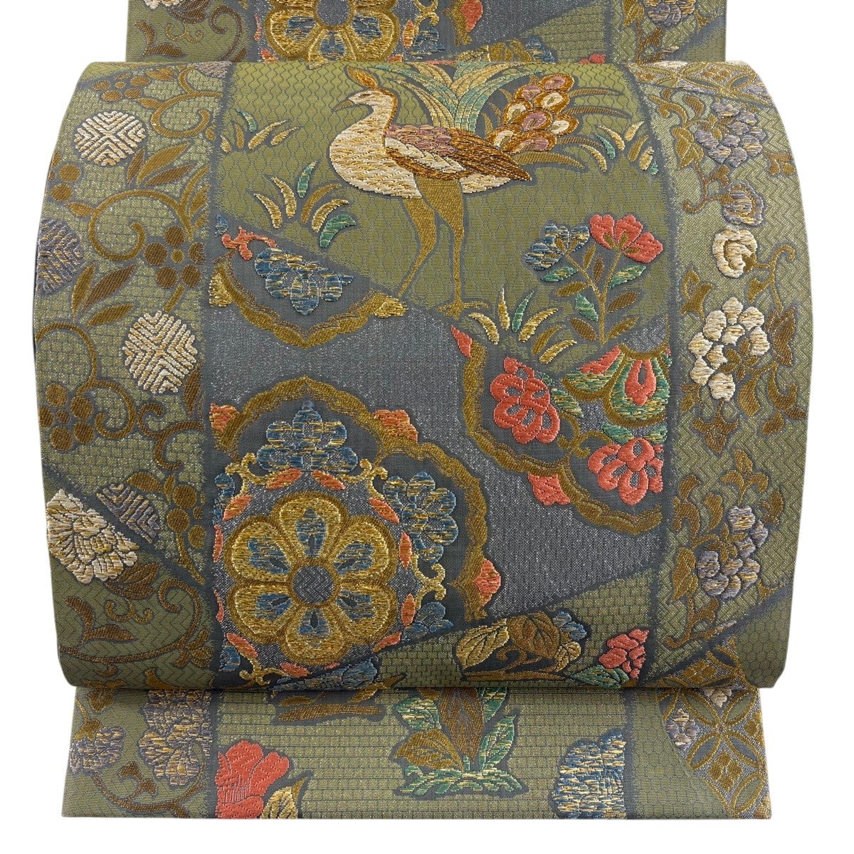 袋帯 秀品 鳥 華文 金糸 箔 灰緑 六通 正絹