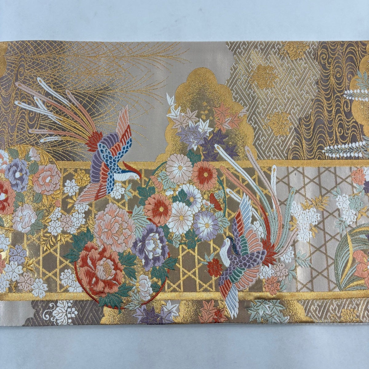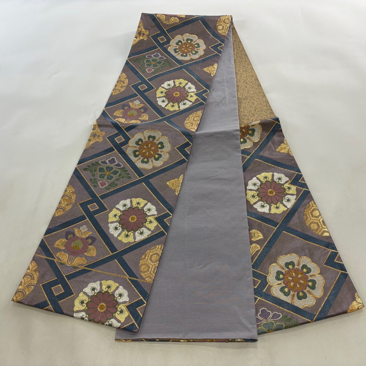 袋帯 名品 松皮菱 七宝 金彩 灰色 全通 正絹