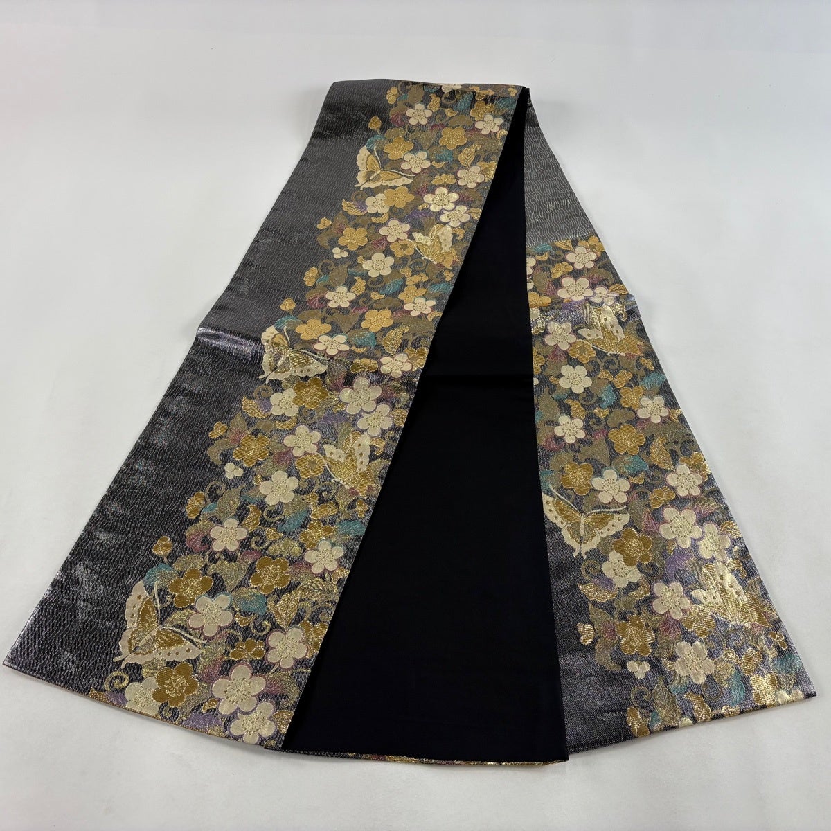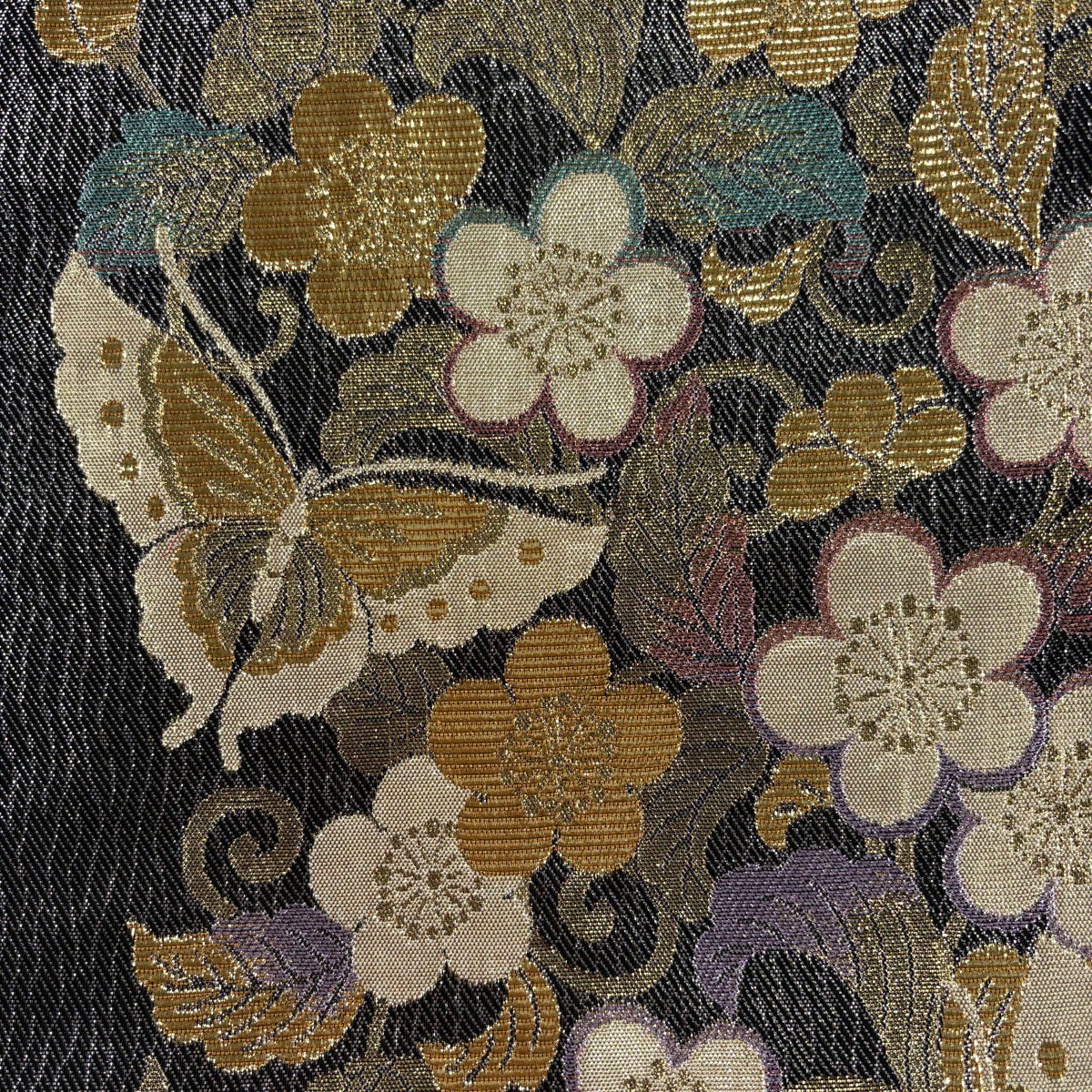 袋帯 秀品 蝶 草花 刺繍 箔 墨色 六通 正絹