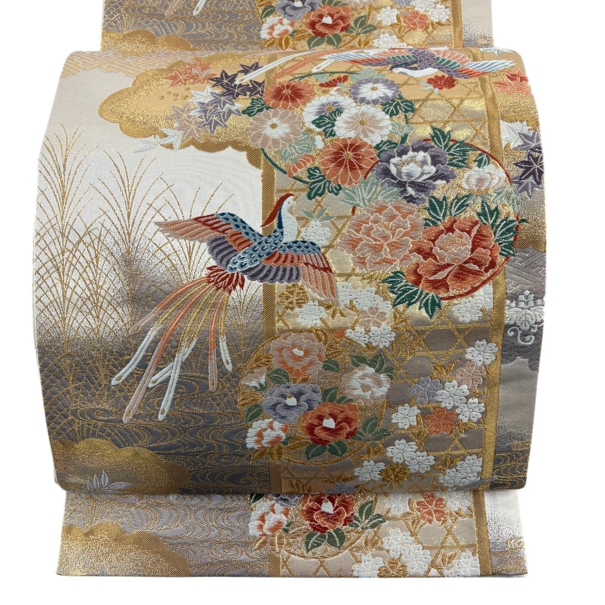 袋帯 秀品 草花 金彩 クリーム お太鼓柄 正絹