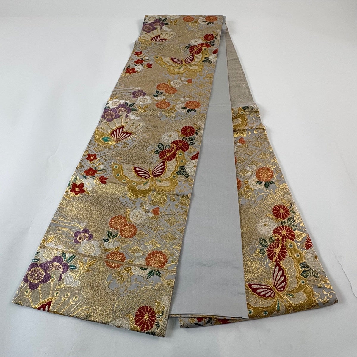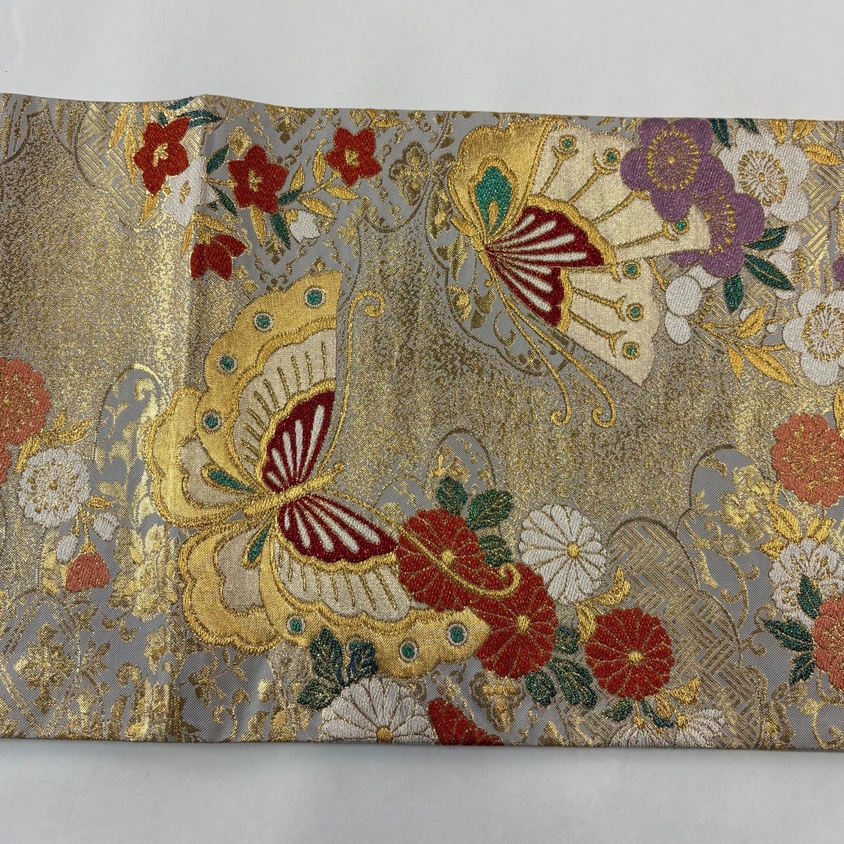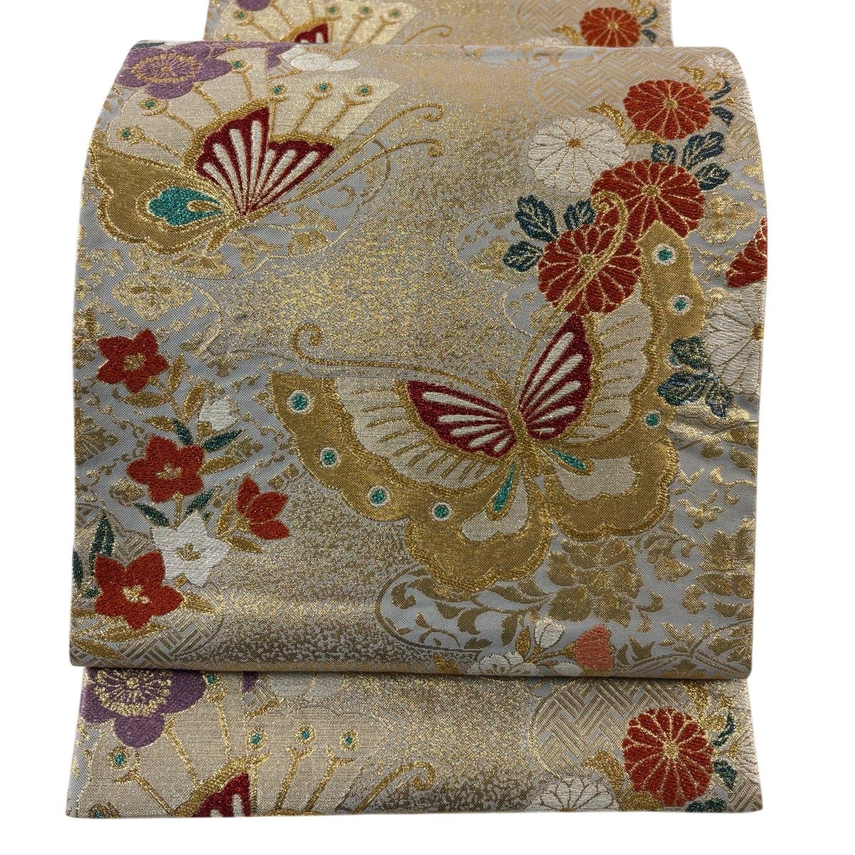 袋帯 秀品 振袖向き 蝶 花 箔 紫 六通 正絹