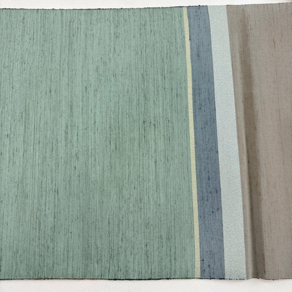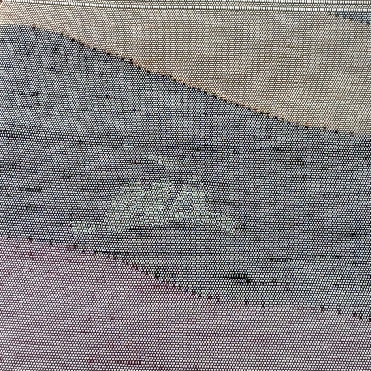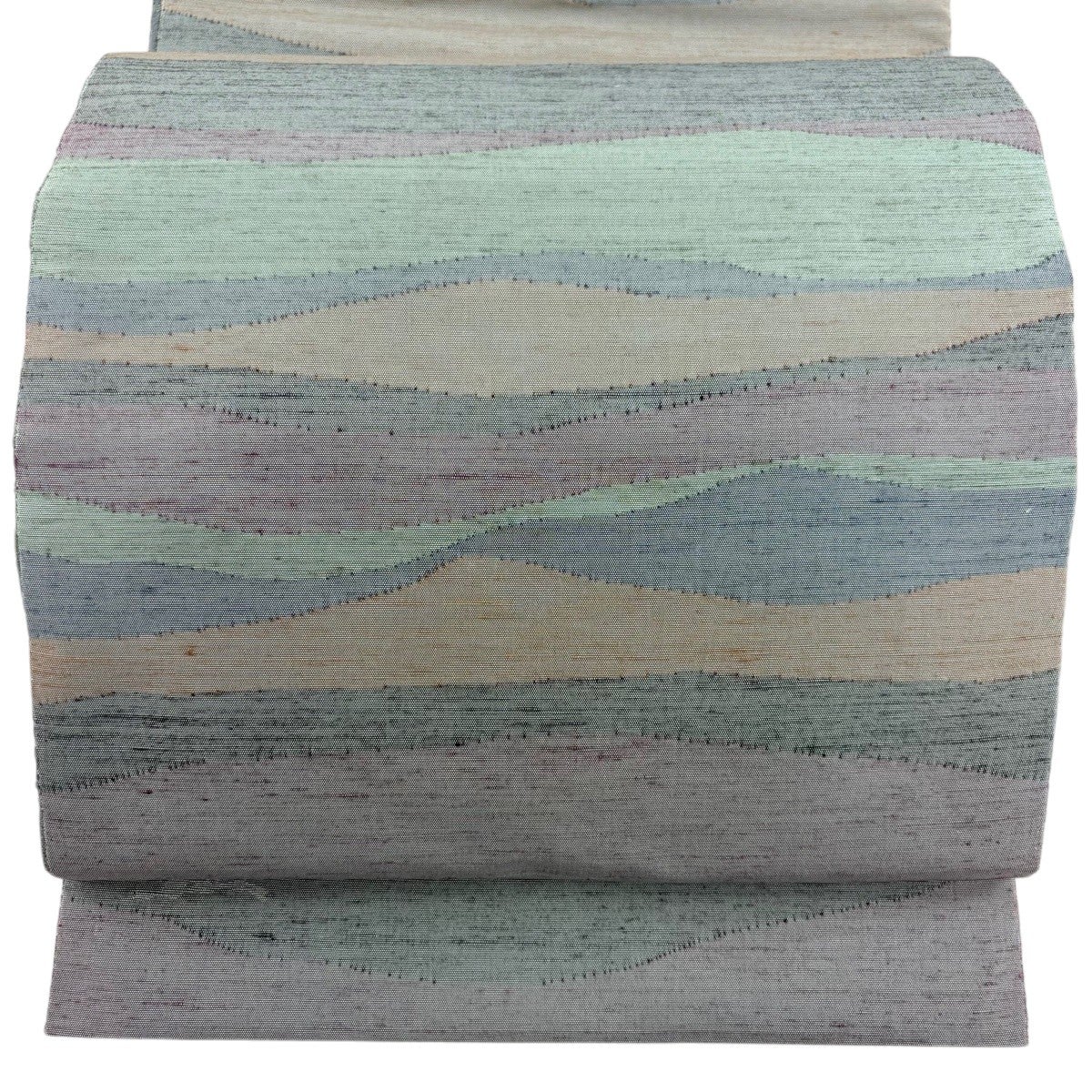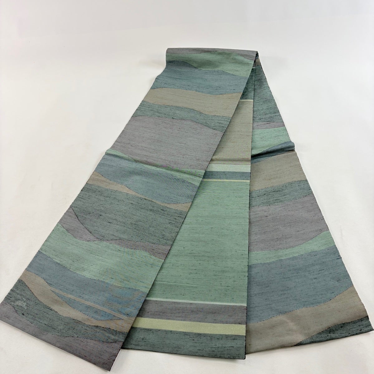 【美品】 袋帯 名品 落款あり 能州紬地 幾何学模様 灰緑 お太鼓柄 正絹