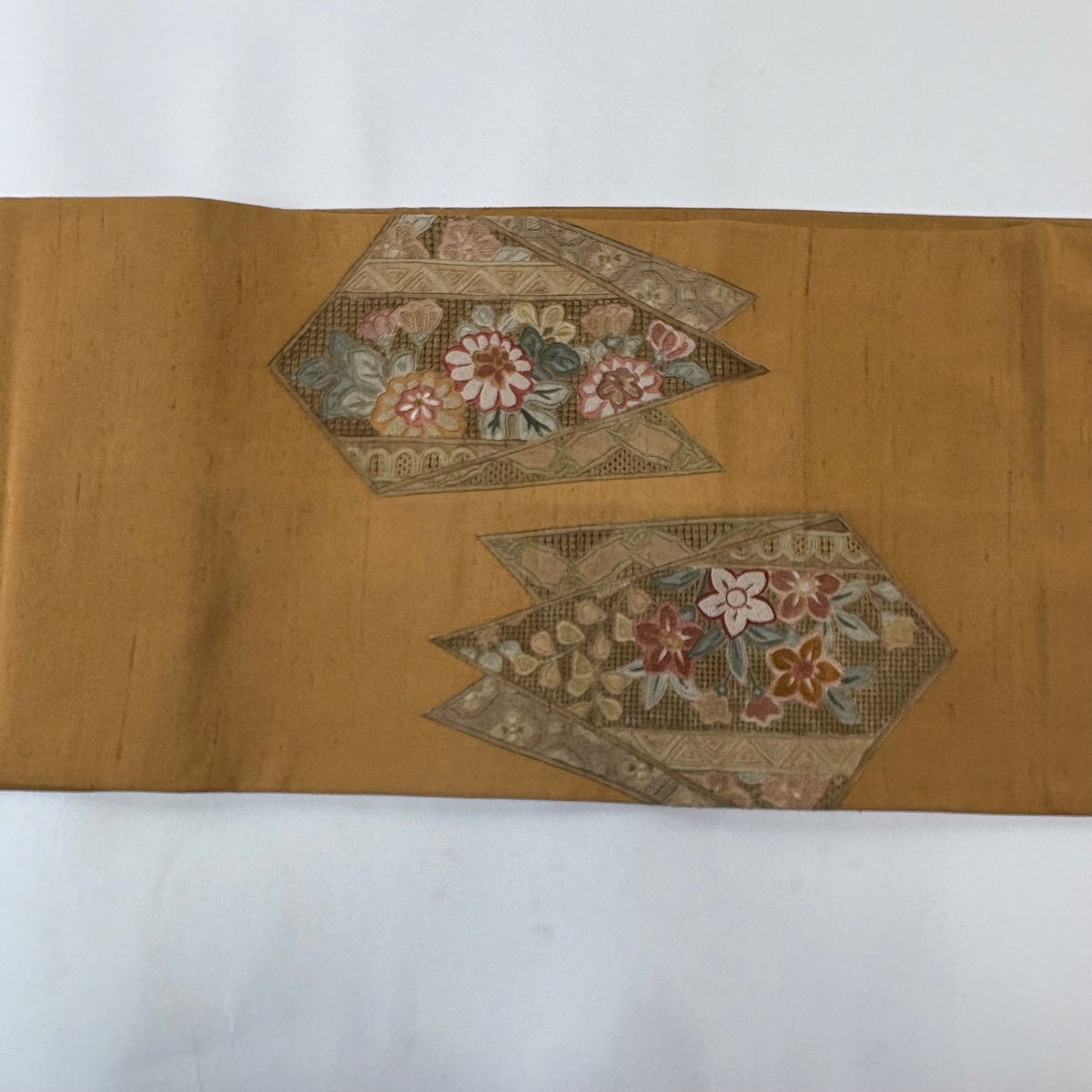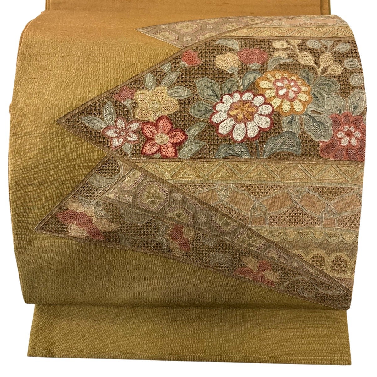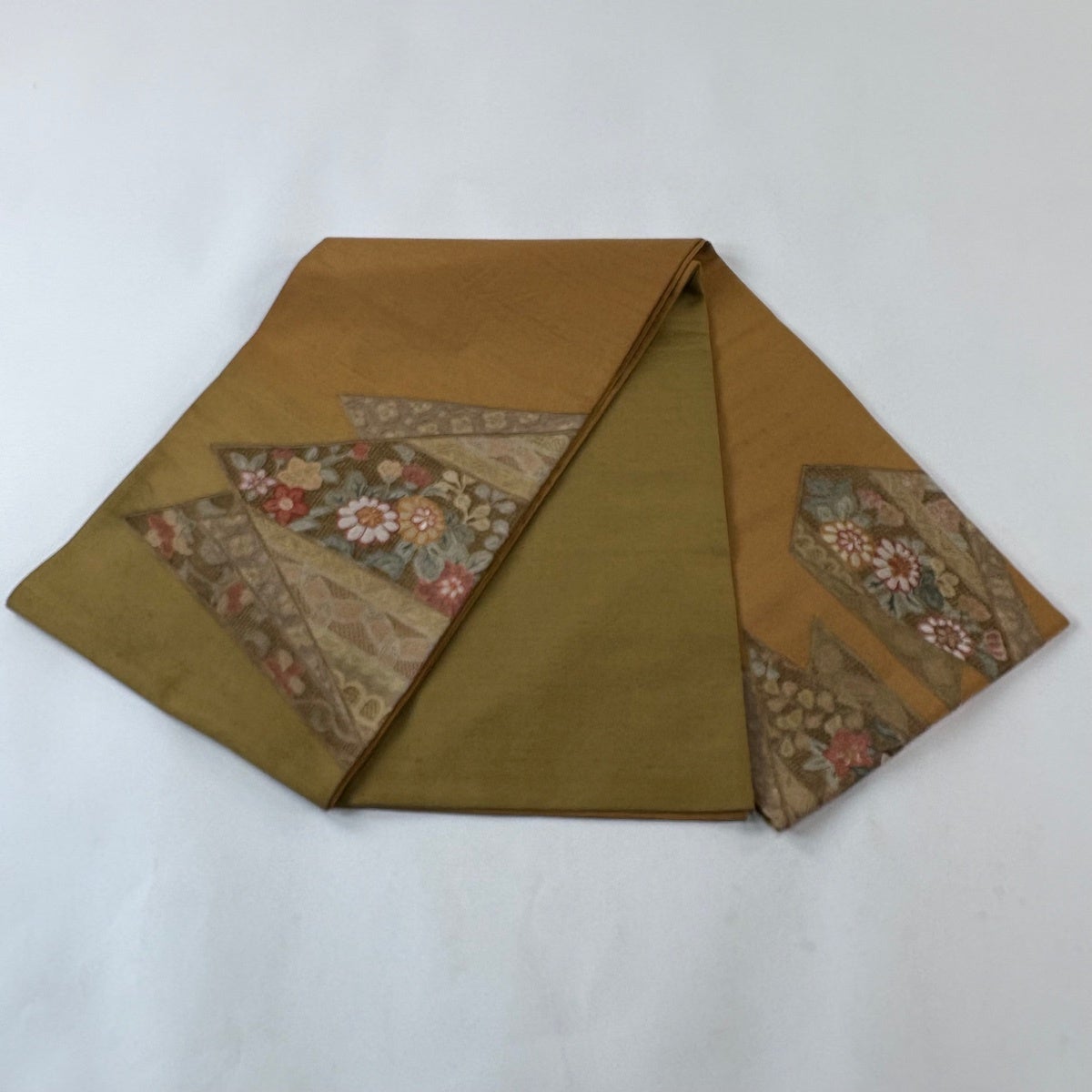 【美品】 袋帯 名品 関西仕立て 華文 花唐草 刺繍 山吹茶色 六通 正絹