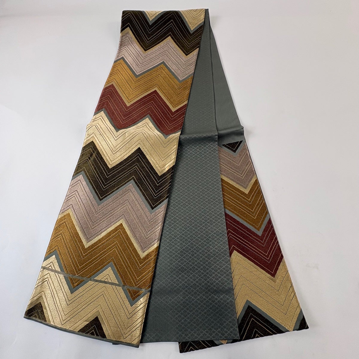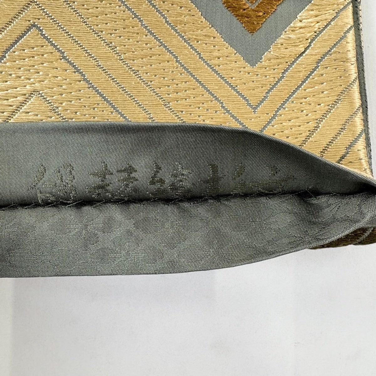 【美品】 袋帯 秀品 落款あり 関西仕立て 段替綾杉文 箔 灰緑 六通 正絹