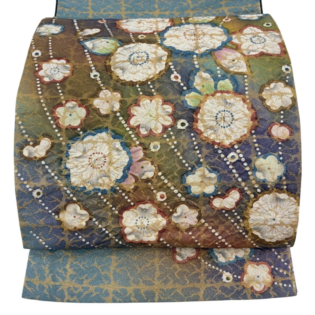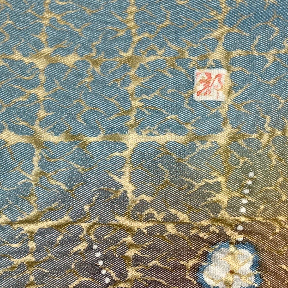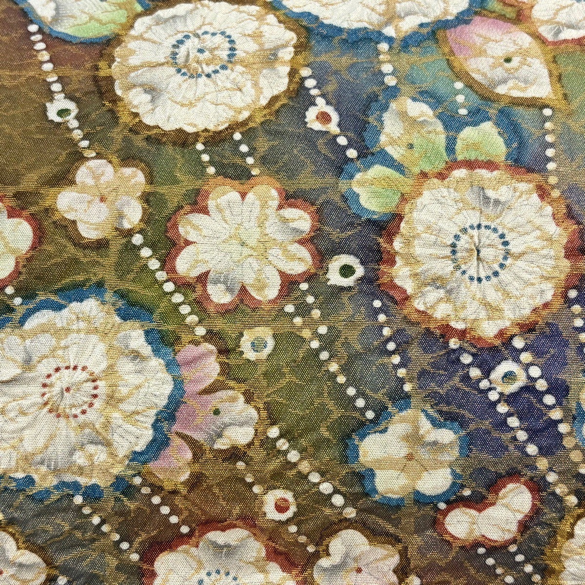 袋帯 秀品 西陣織元謹製 古代問道 七宝 花 金糸 ベージュ 六通 正絹