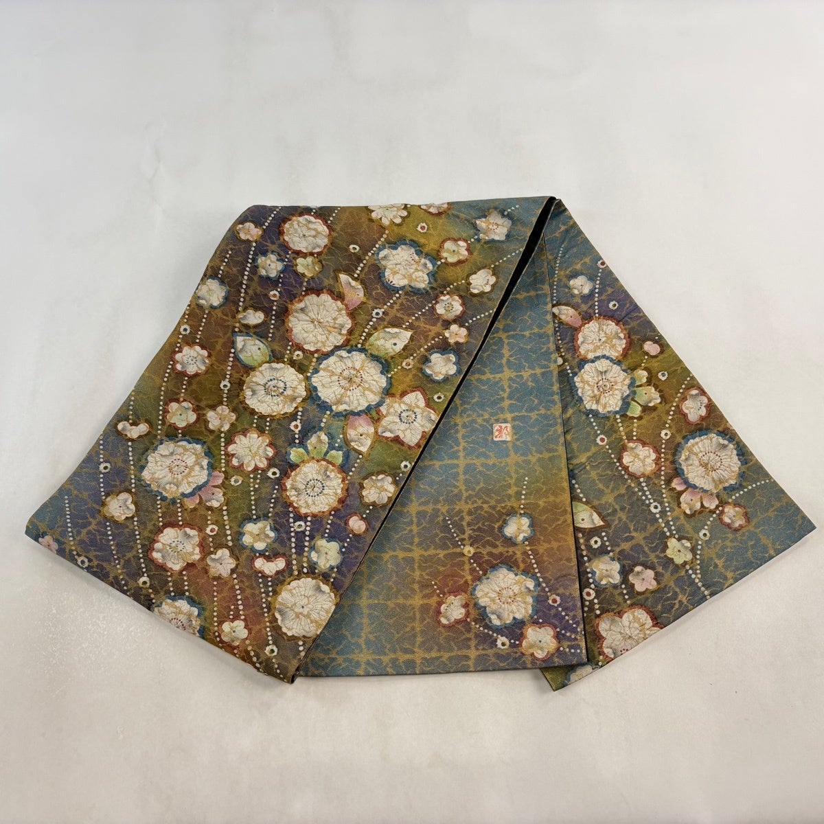 【美品】 袋帯 秀品 落款あり 麗美更紗 華文 金糸 箔 茶緑色 六通 正絹