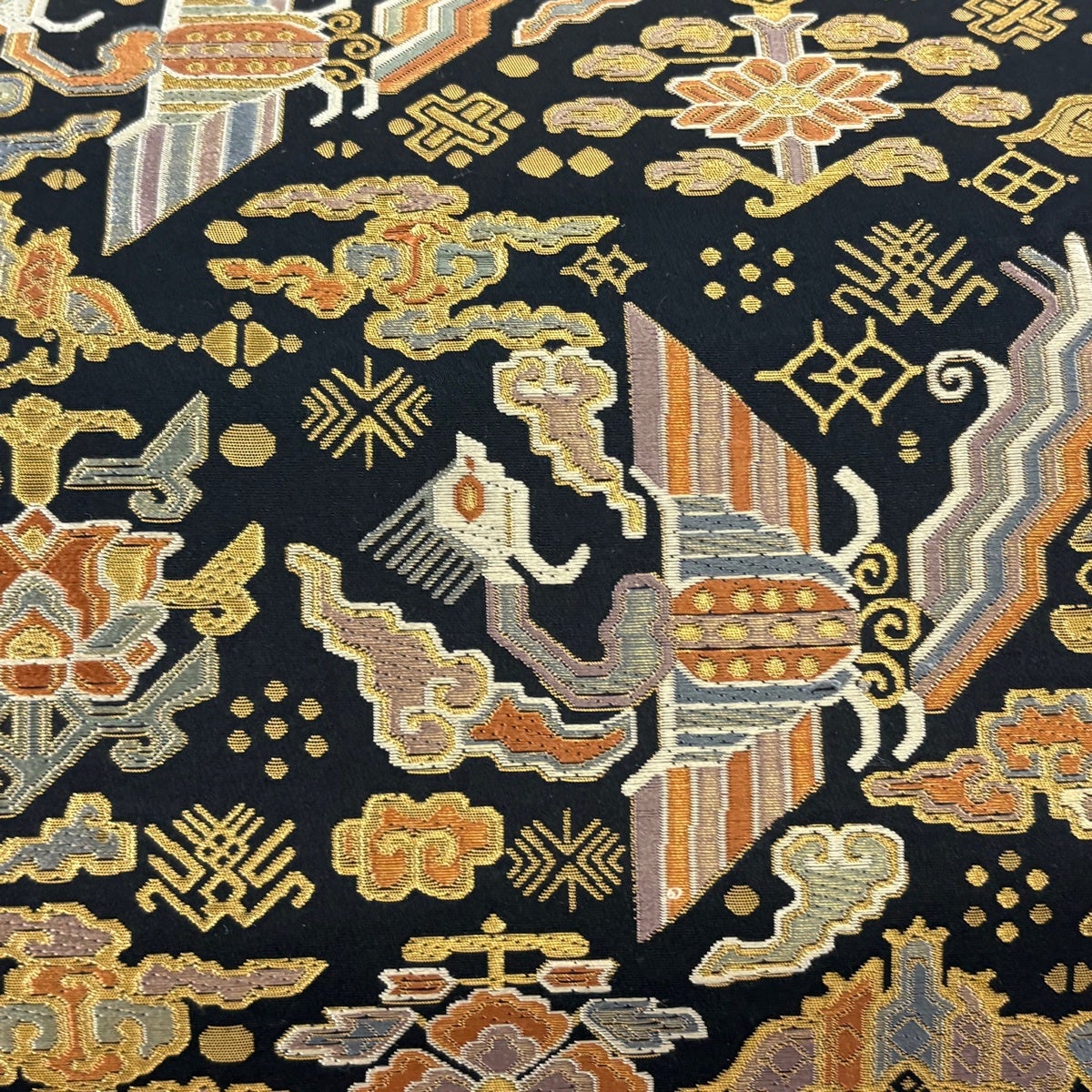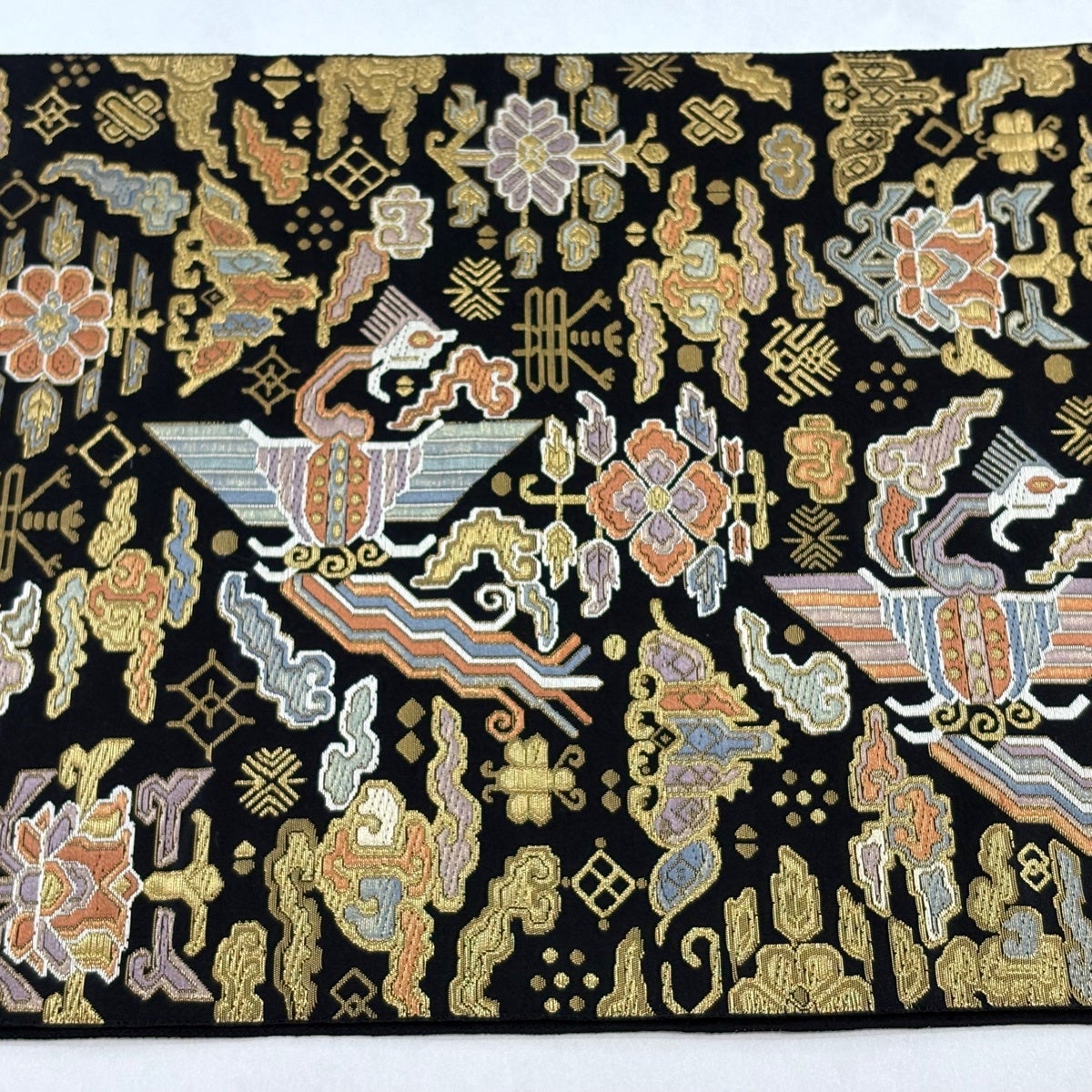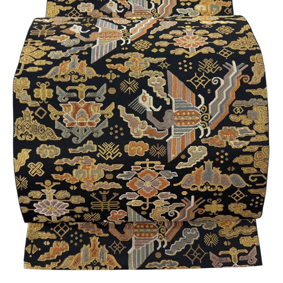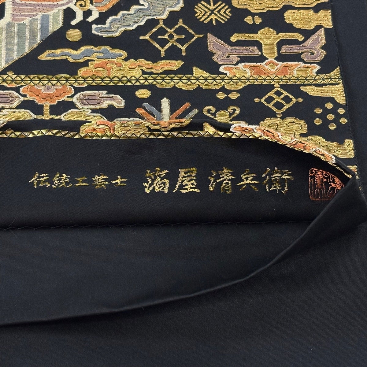 【美品】 袋帯 名品 箔屋清兵衛 落款あり 鳥 草花 箔 金糸 黒 六通 正絹
