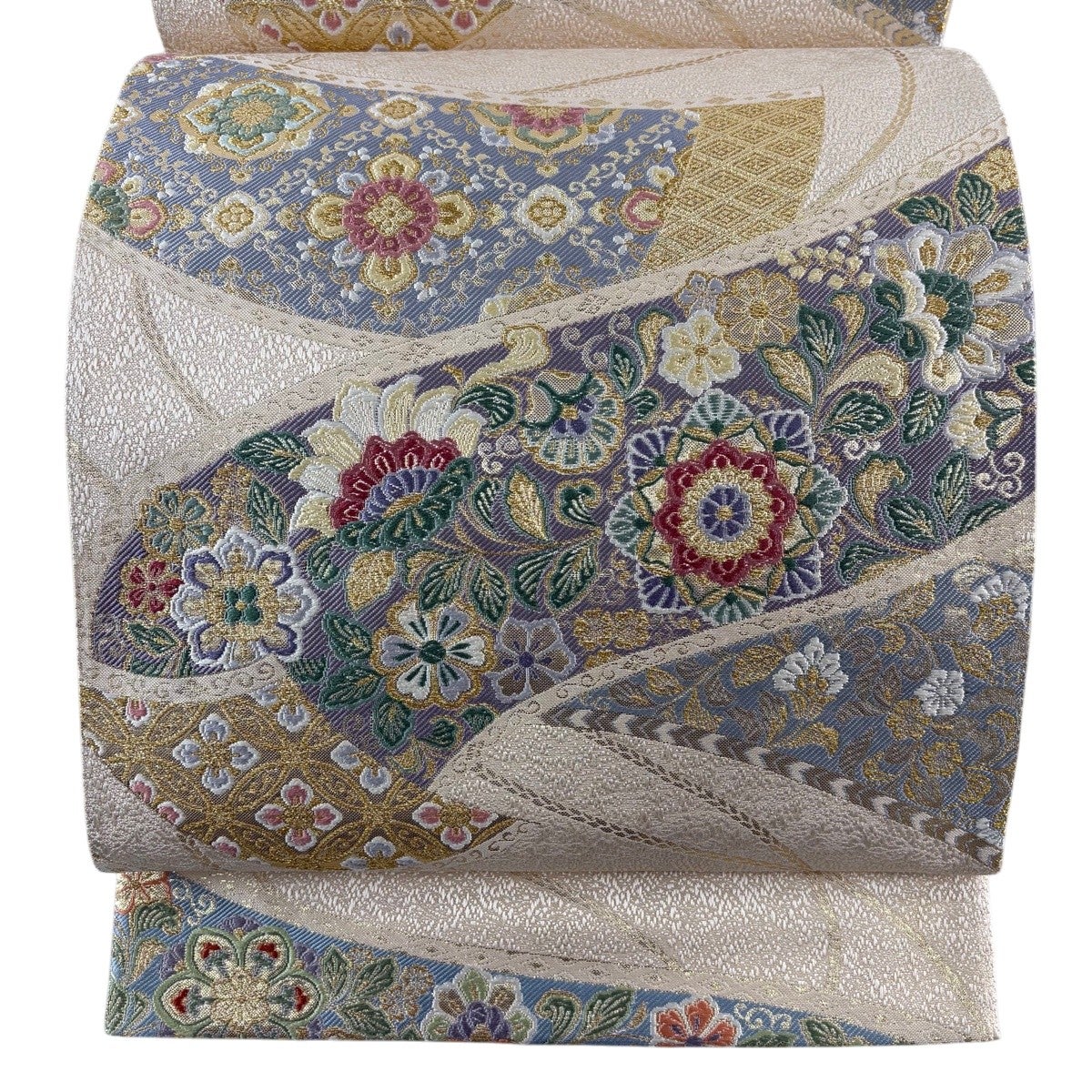 【美品】 袋帯 秀品 夏帯 絽 草花 流水 金銀糸 クリーム お太鼓柄 正絹