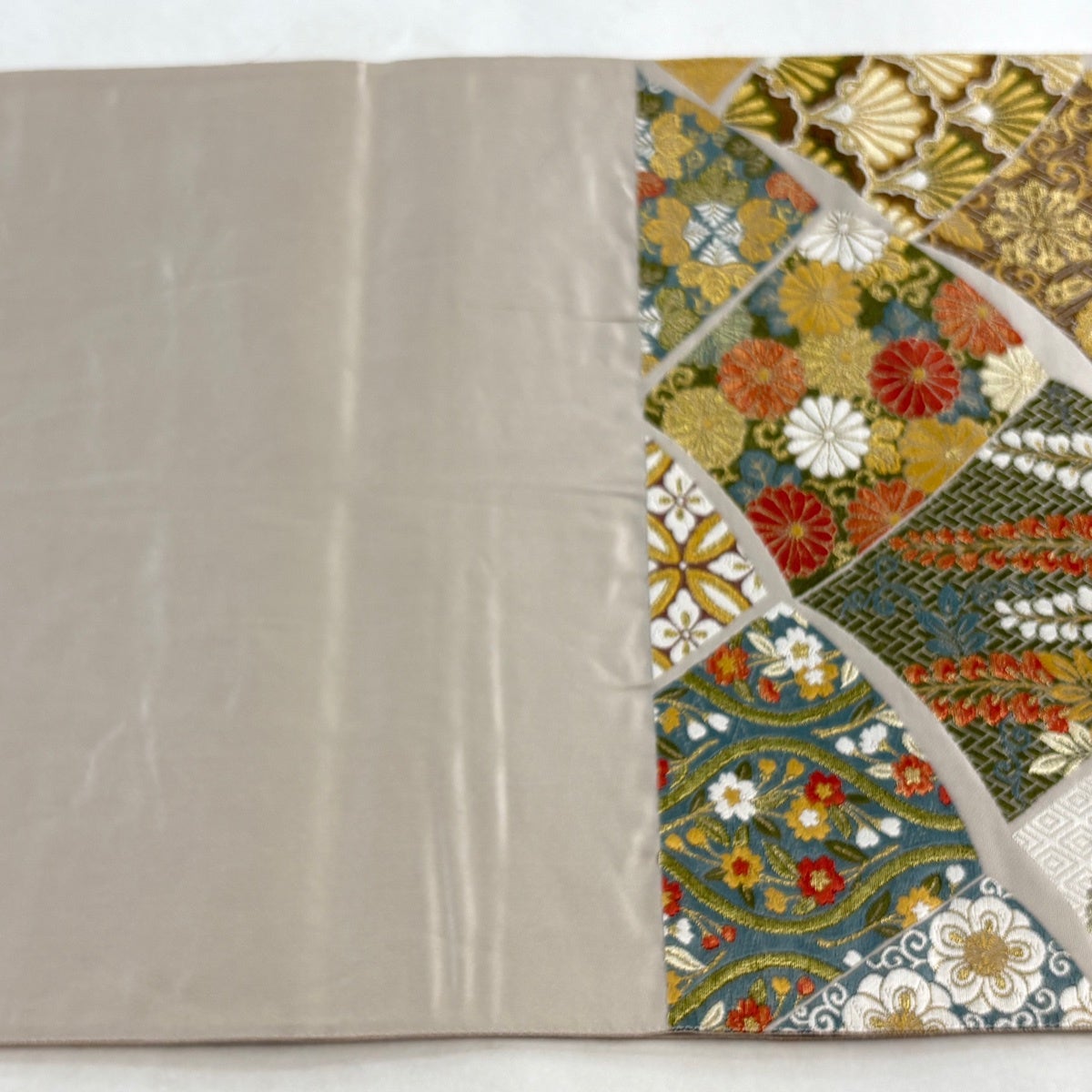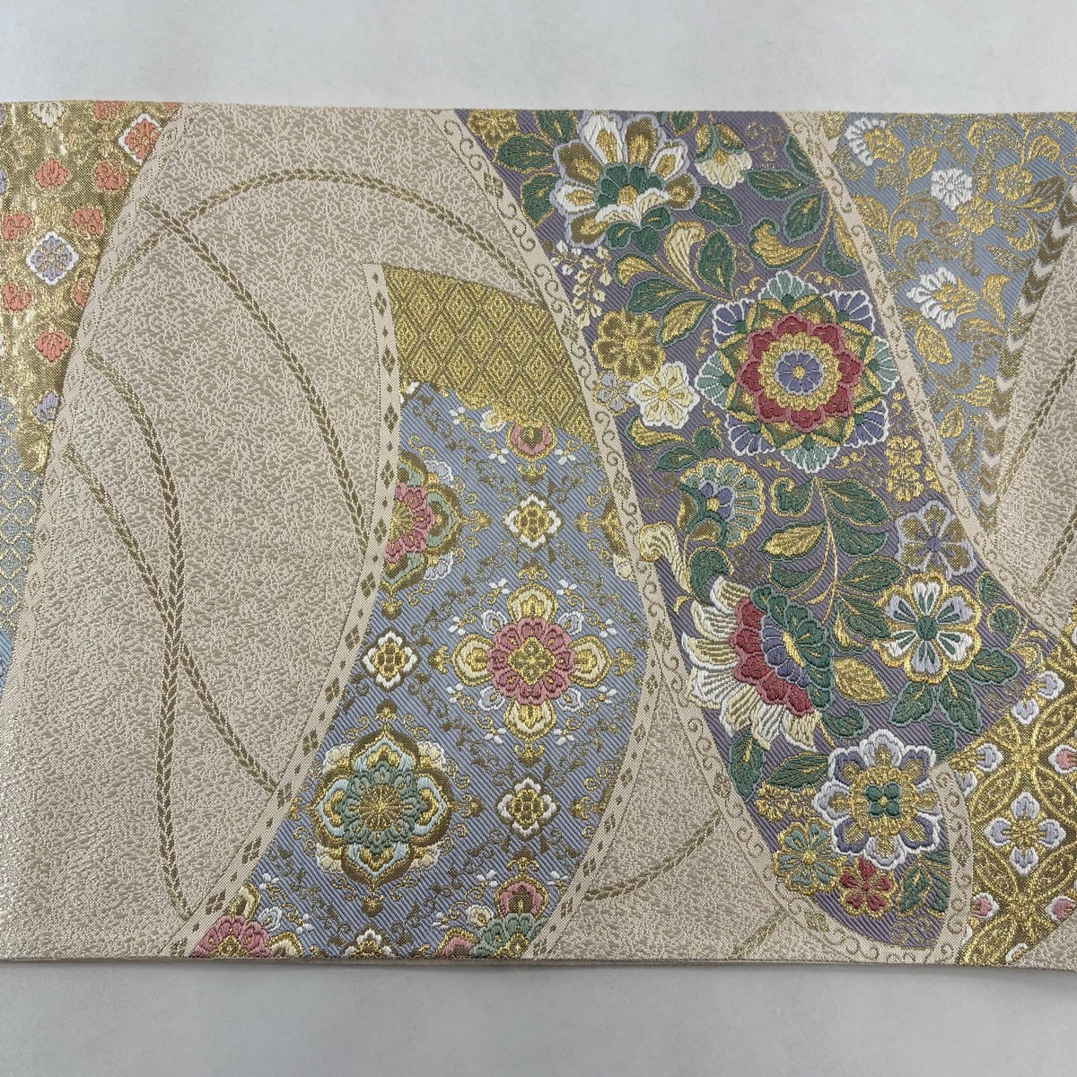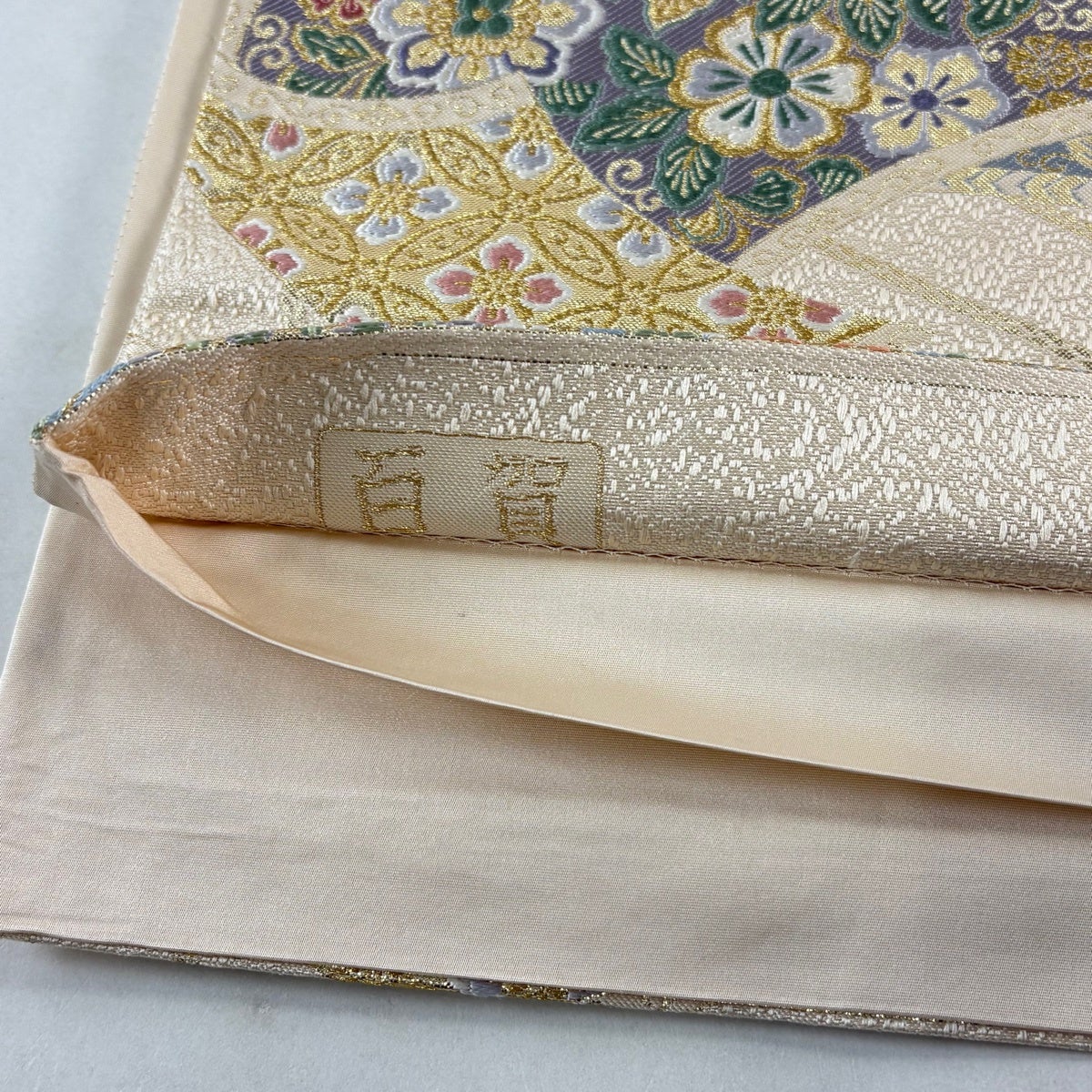 【美品】 袋帯 秀品 百賀 華文 草花 刺繍 金糸 ベージュ 六通 正絹