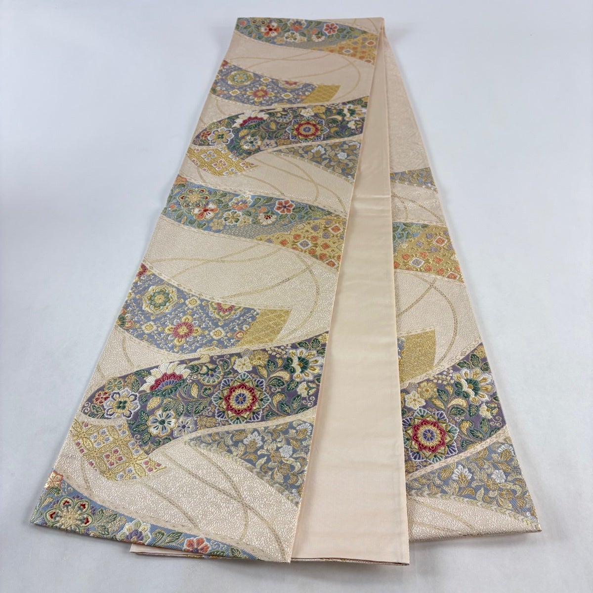 袋帯 秀品 夏帯 青海波 波頭 金銀糸 箔 ピンクベージュ 六通 正絹