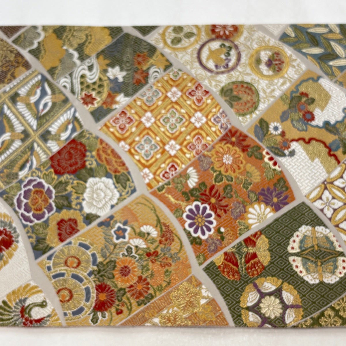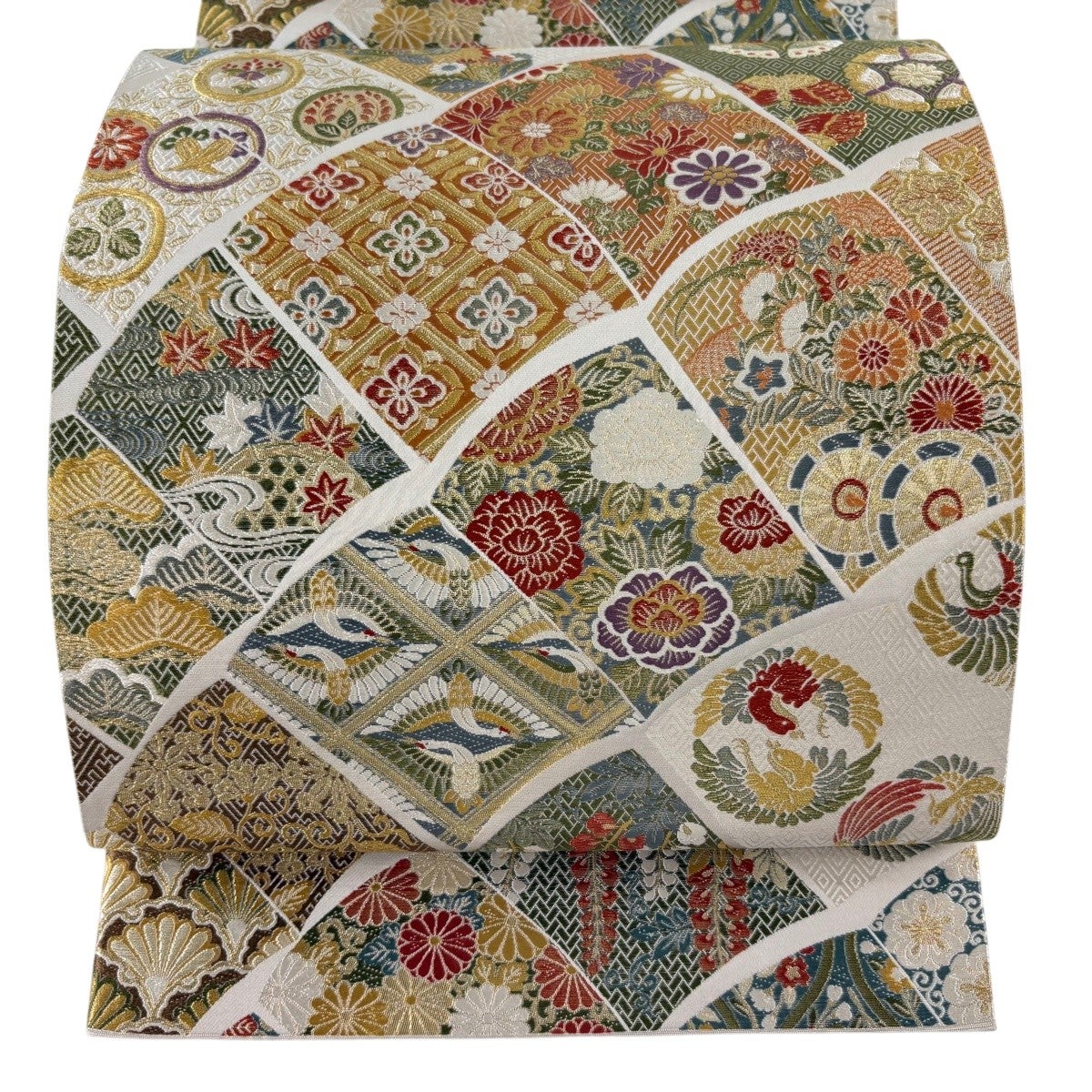 袋帯 名品 落款あり 徳川美術館秘蔵 扇 花鳥 金糸 箔 金色 お太鼓柄 正絹