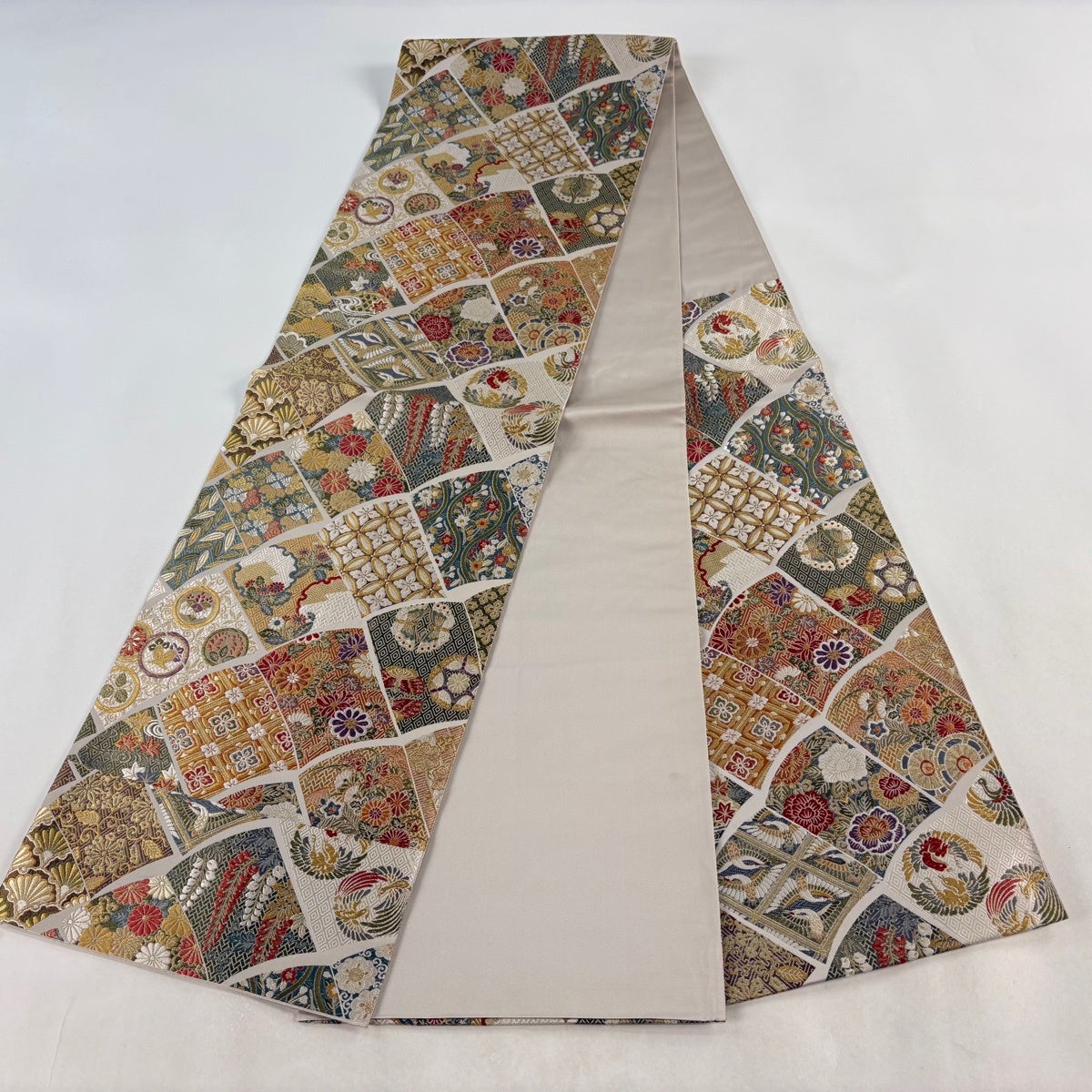 袋帯 名品 落款あり 徳川美術館秘蔵 扇 花鳥 箔 金糸 金色 お太鼓柄 正絹