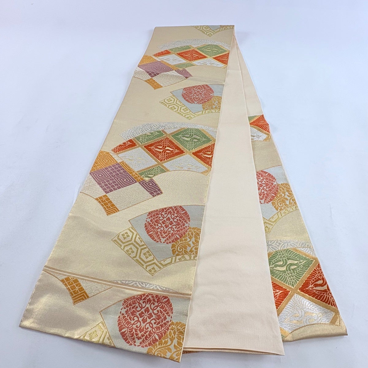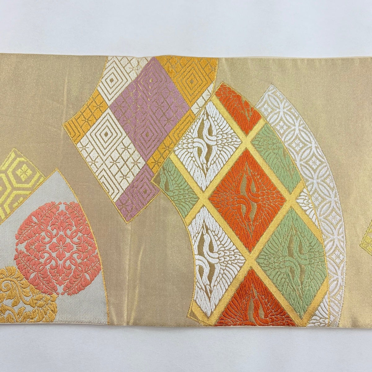 【美品】 袋帯 逸品 川島織物 落款あり 扇面 華文 金糸 刺繍 オレンジ 六通 正絹