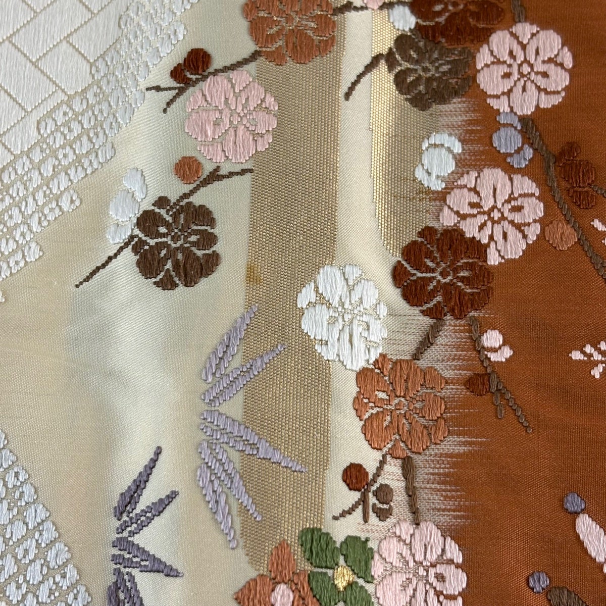 袋帯 逸品 落款あり 織匠十一代目 篠原宗兵衛 草花 段縞 金銀糸 クリーム 六通 正絹