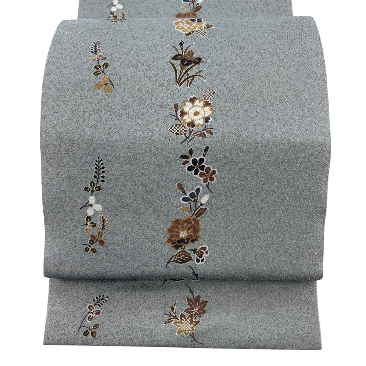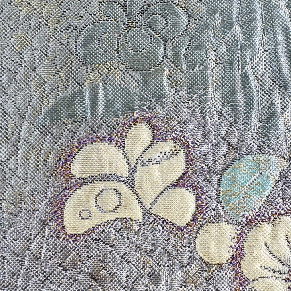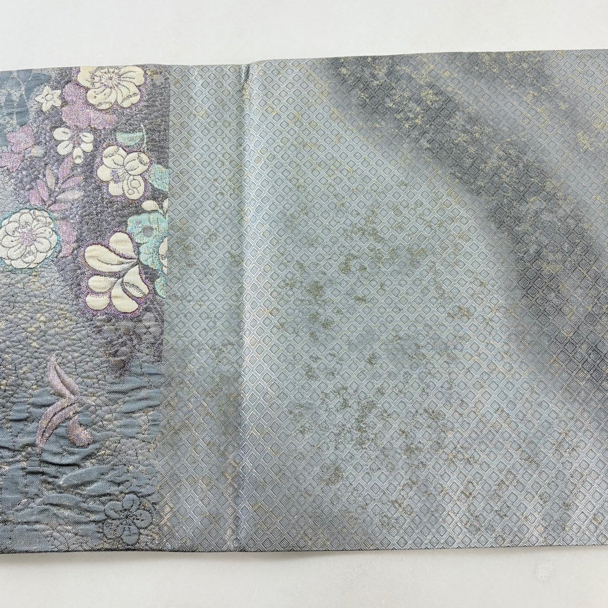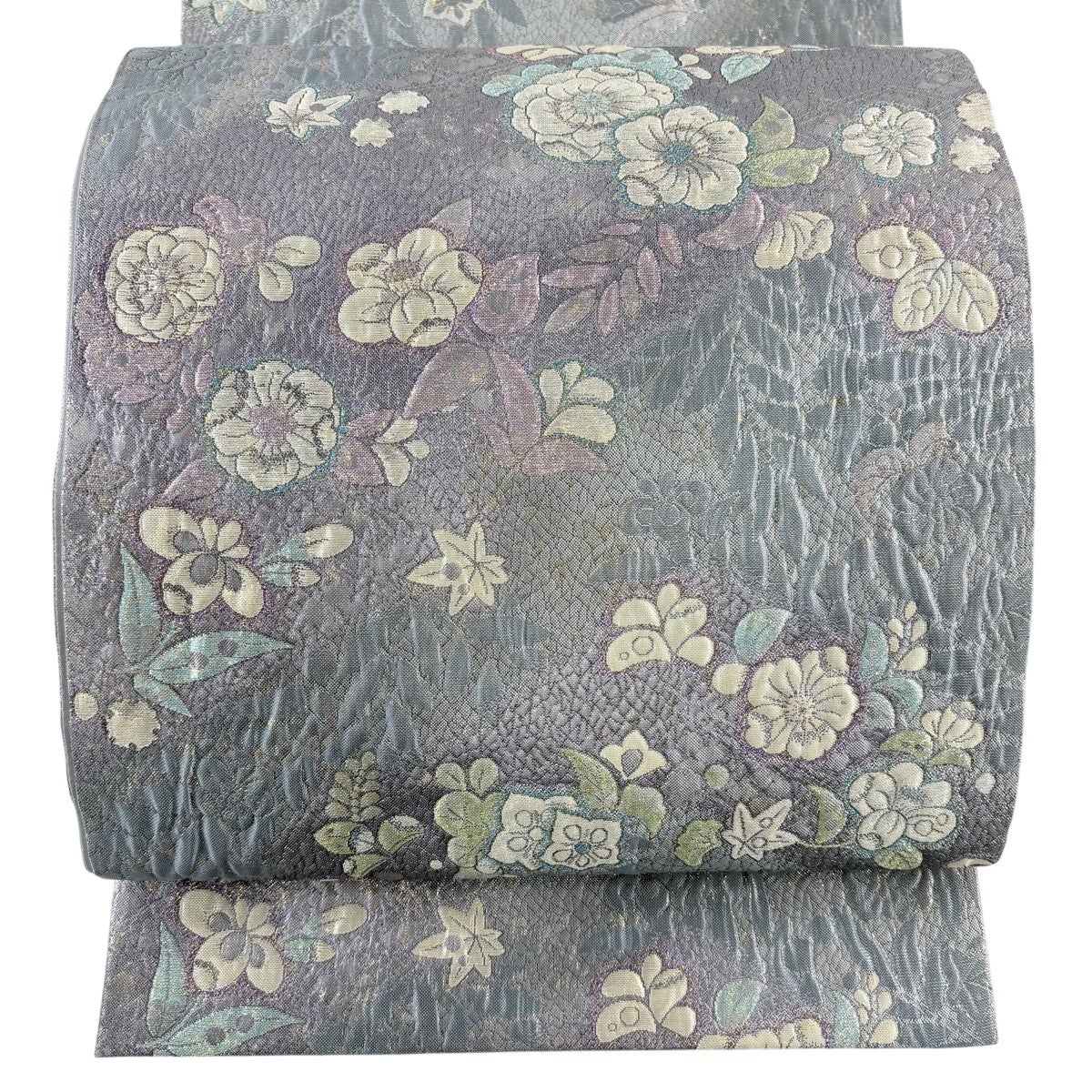 【美品】 袋帯 名品 花 青灰色 全通 正絹