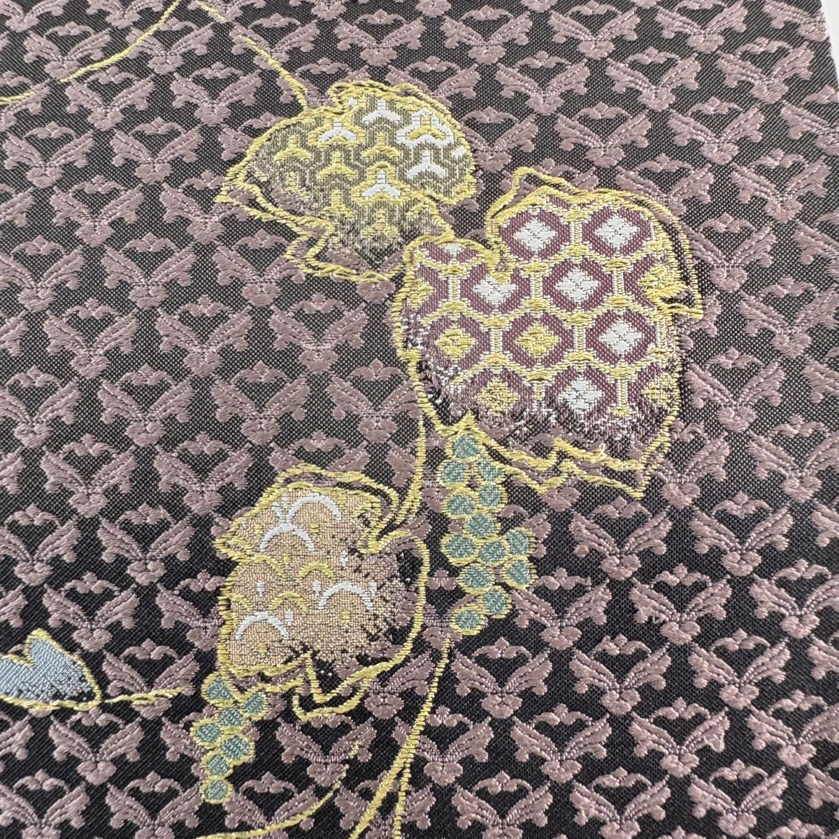 袋帯 名品 葡萄 金糸 刺繍 黒 六通 正絹
