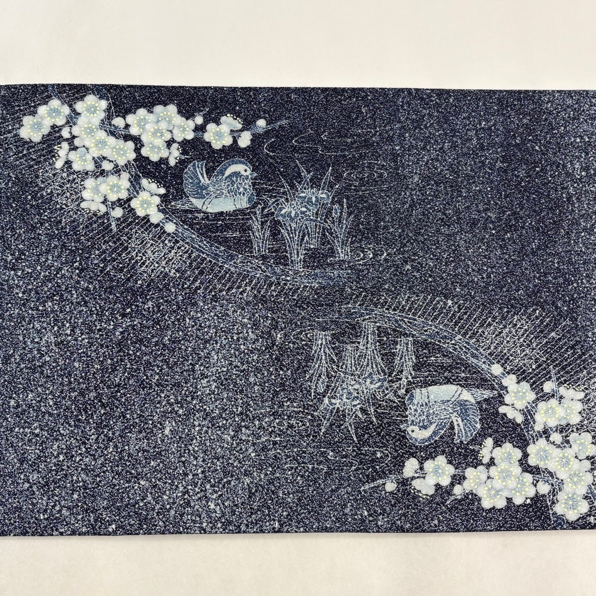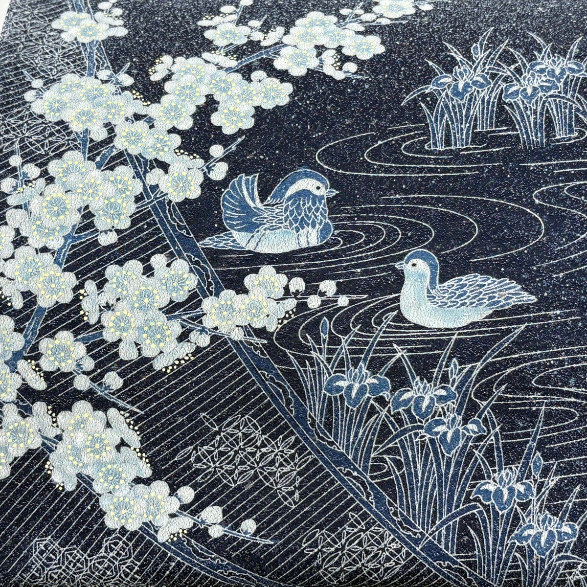 反物 秀品 付下げ 鴛鴦 草花 金彩 灰緑 正絹