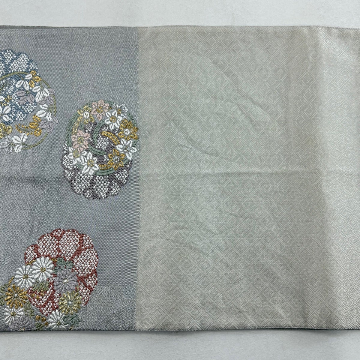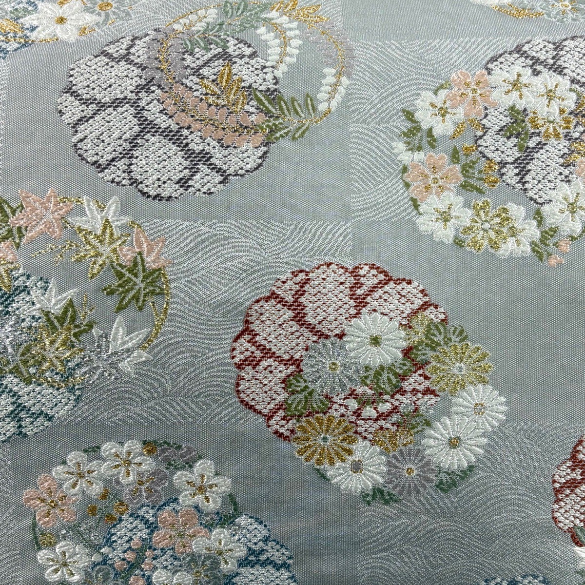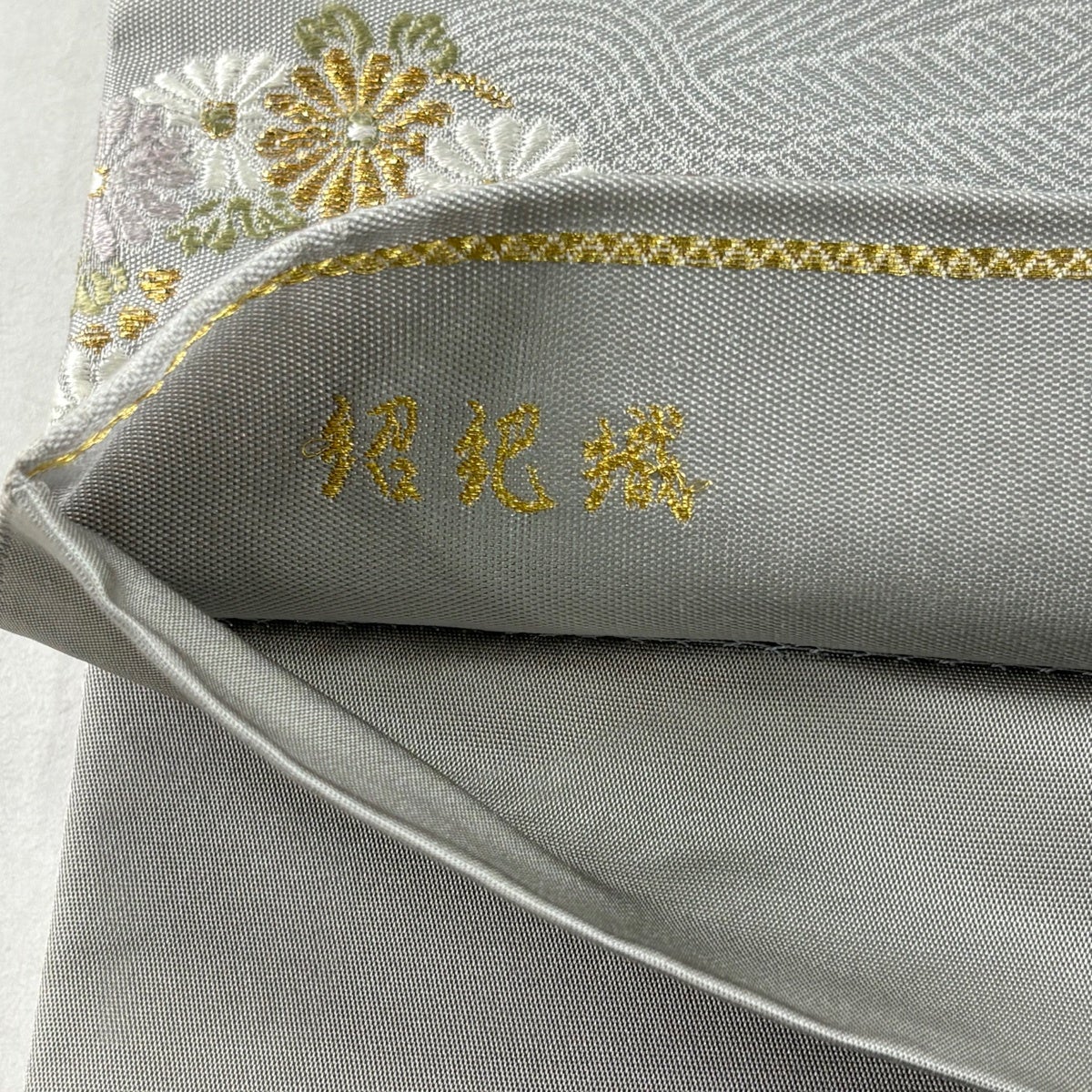 袋帯 秀品 花丸文 菊 金銀糸 箔 灰色 六通 正絹