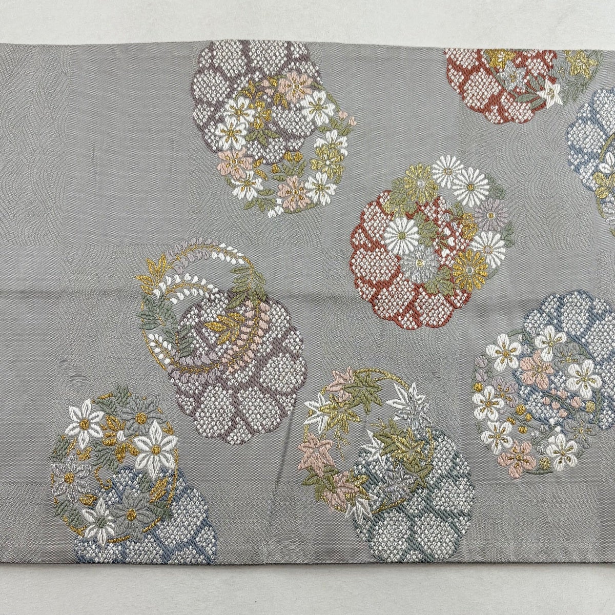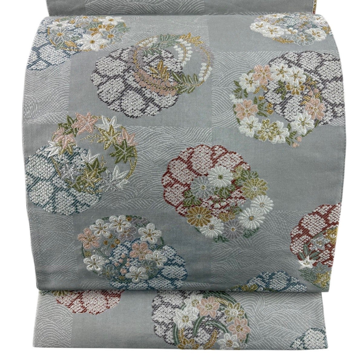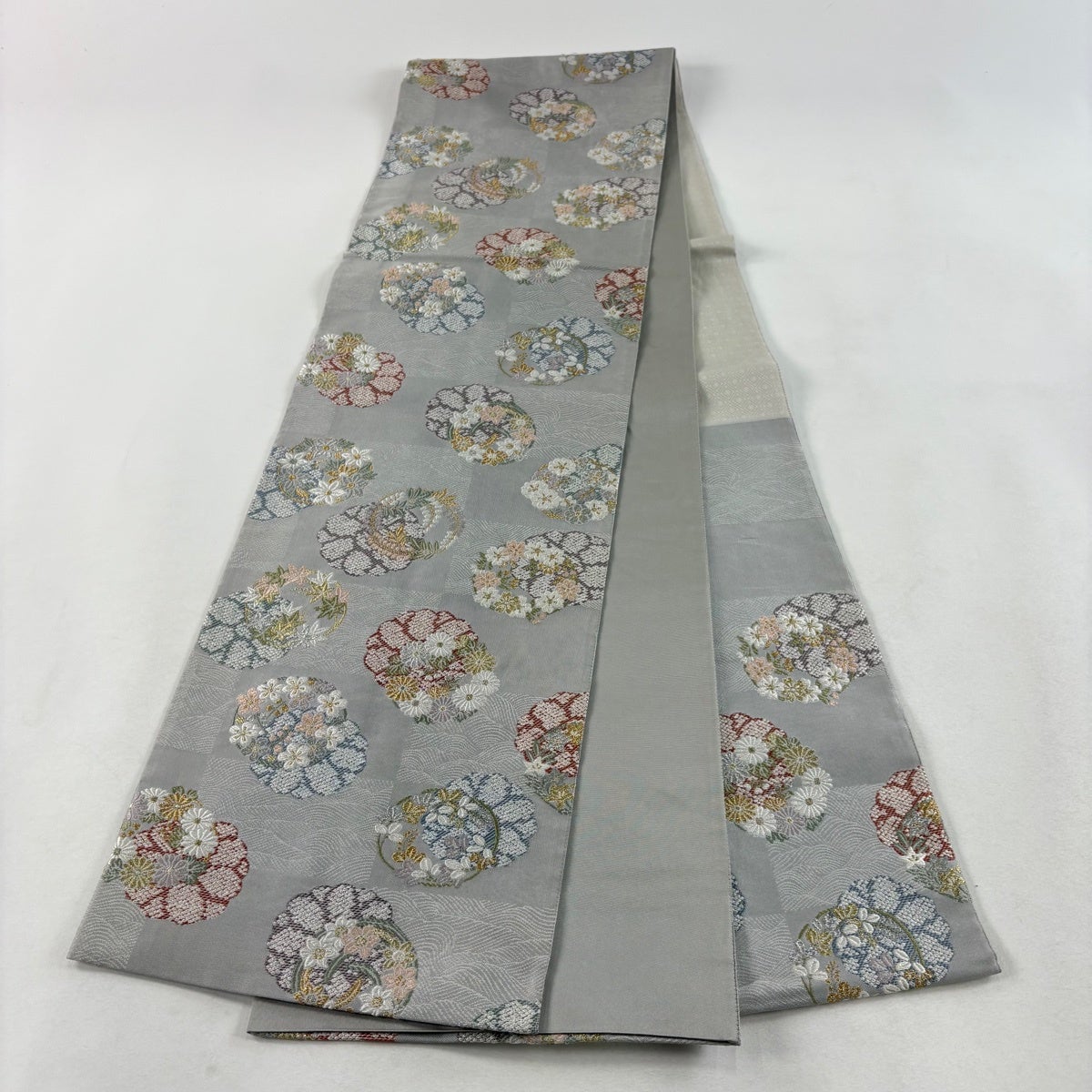 袋帯 秀品 花丸文 菊 金銀糸 箔 灰色 六通 正絹