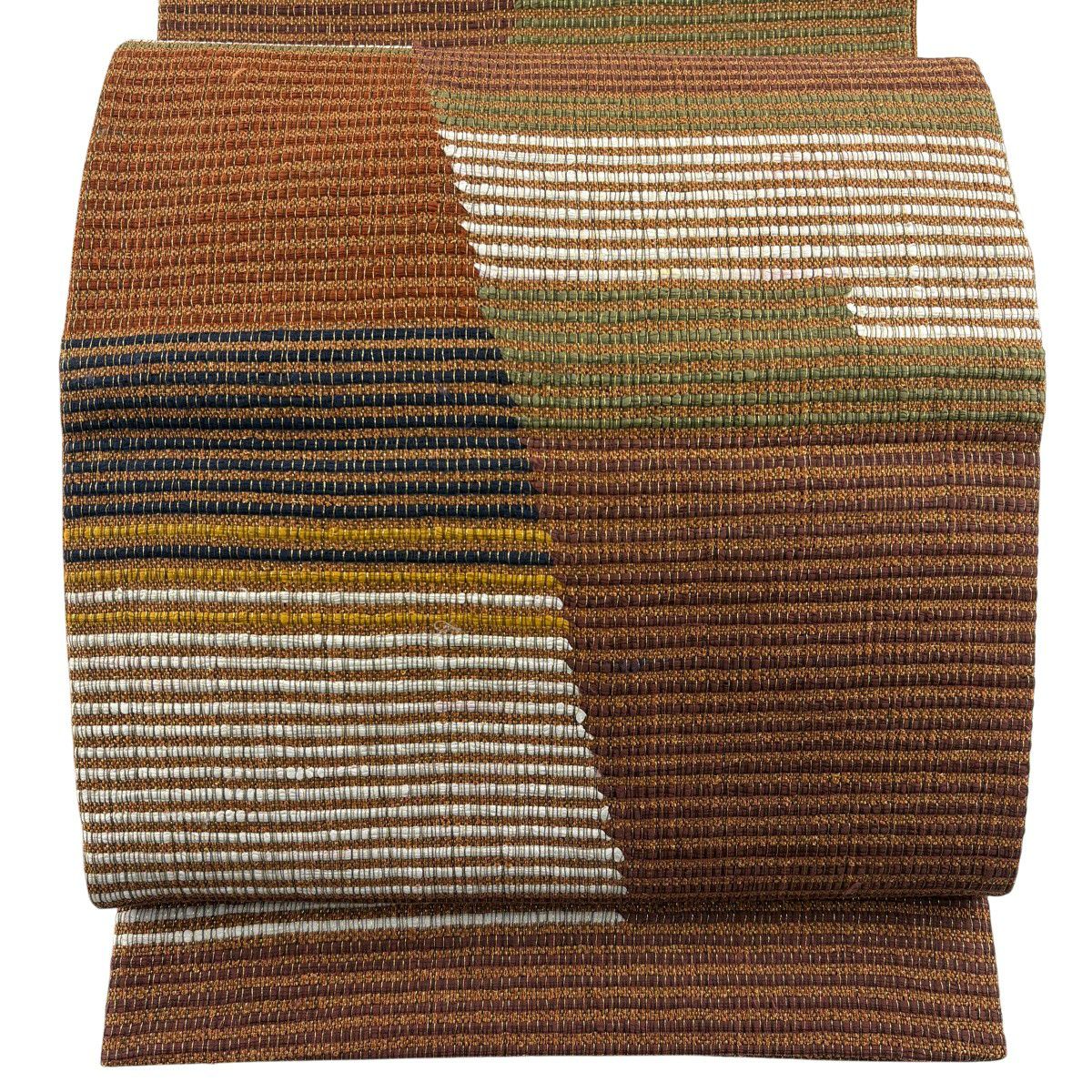 袋帯 秀品 格子 幾何学 黄土色 全通 正絹