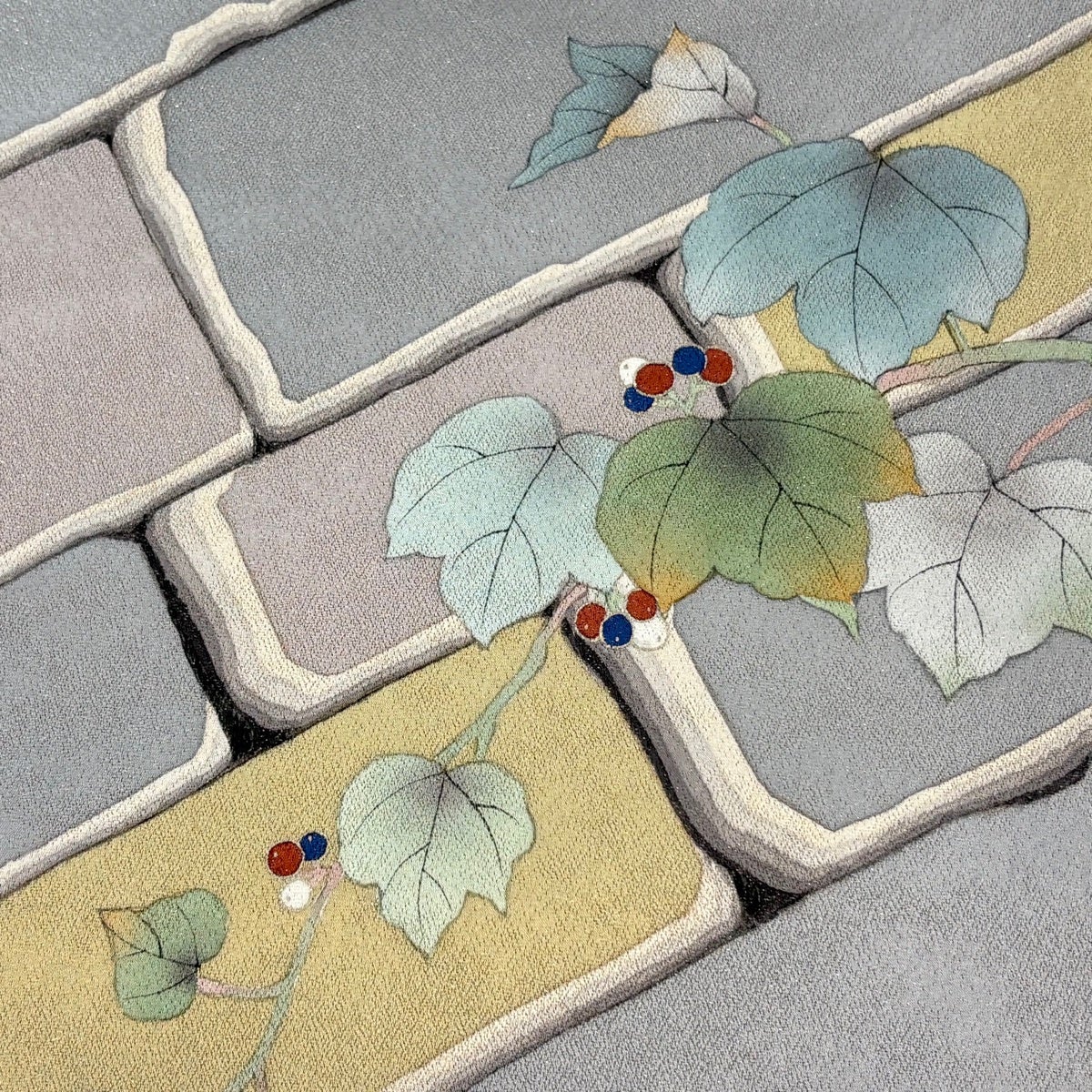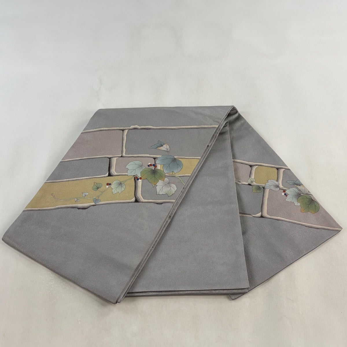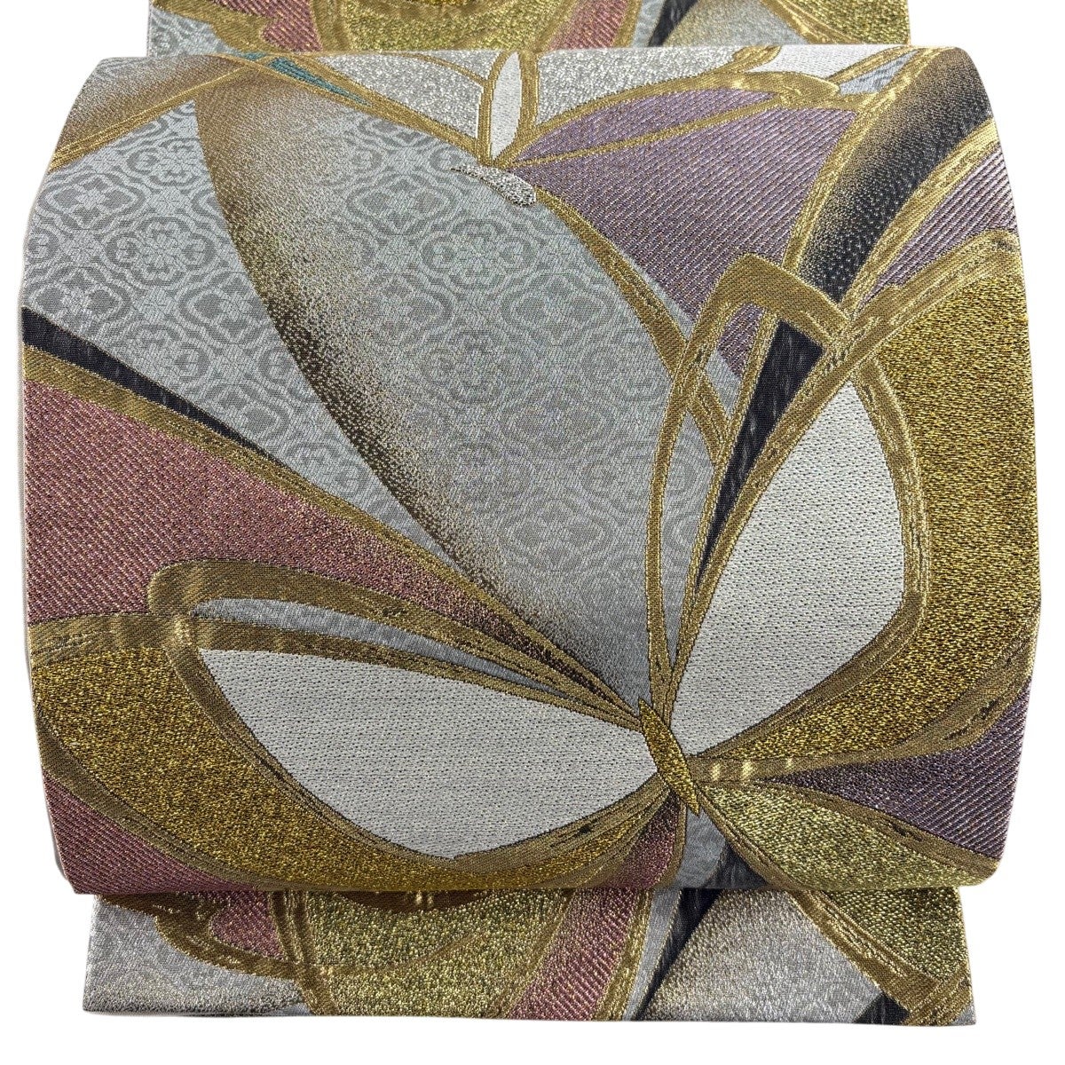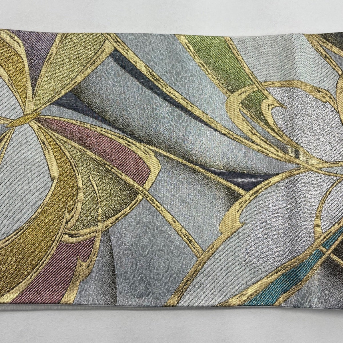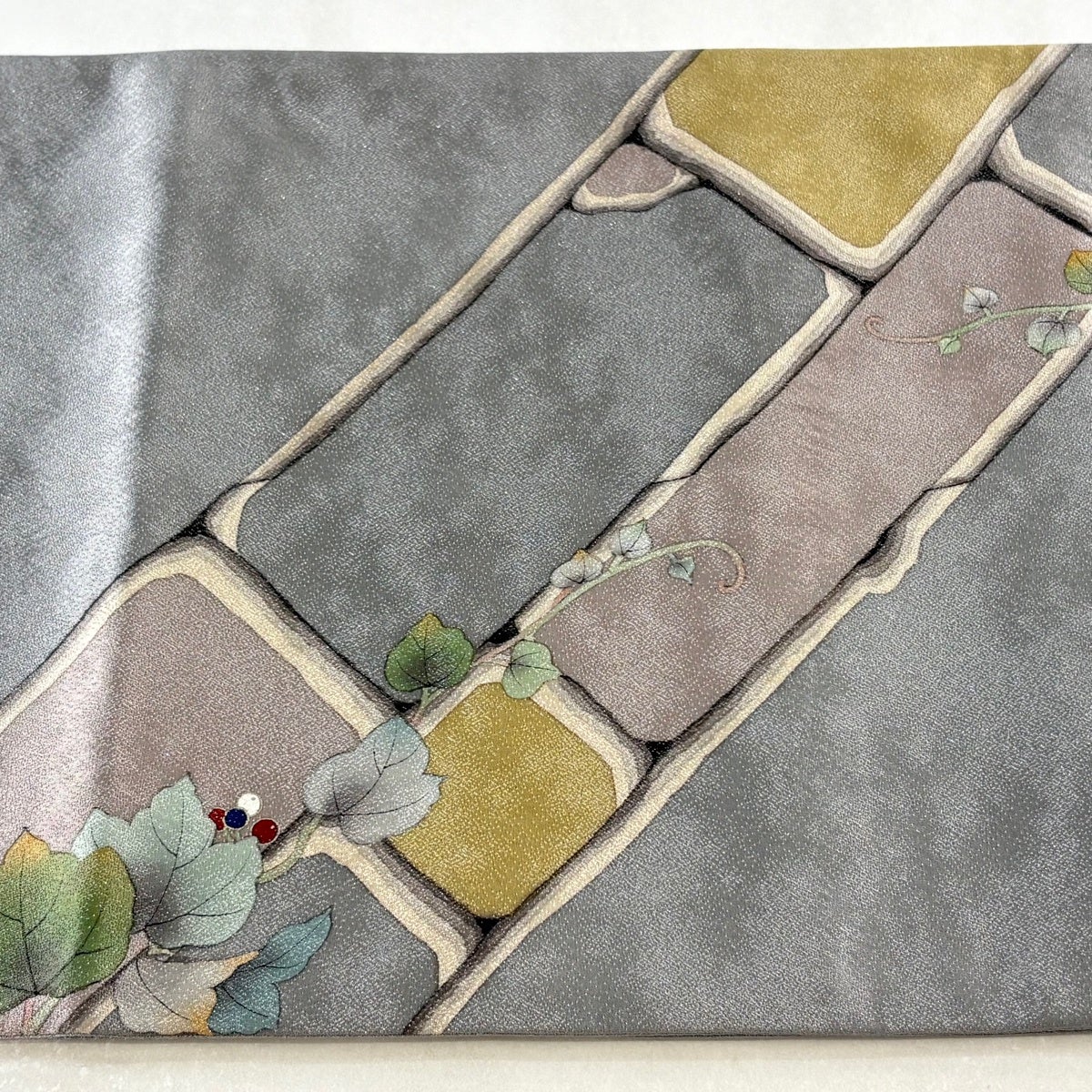 袋帯 名品 葉と実 幾何学 箔 銀彩 灰色 お太鼓柄 正絹