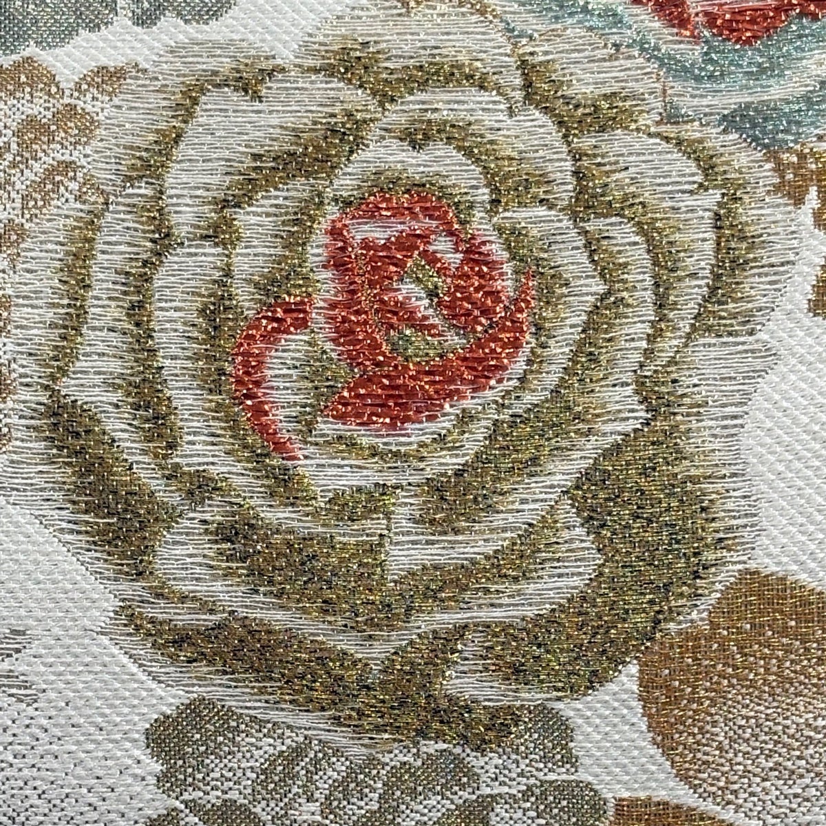 【美品】 袋帯 秀品 花 幾何学 箔 クリーム 六通 正絹