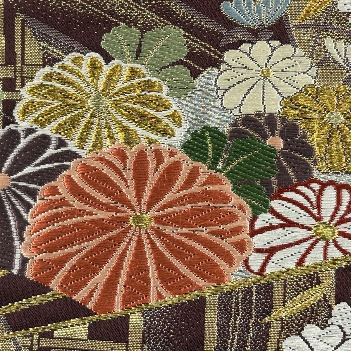 【美品】 袋帯 秀品 花車 橋 唐織 箔 灰茶 六通 正絹