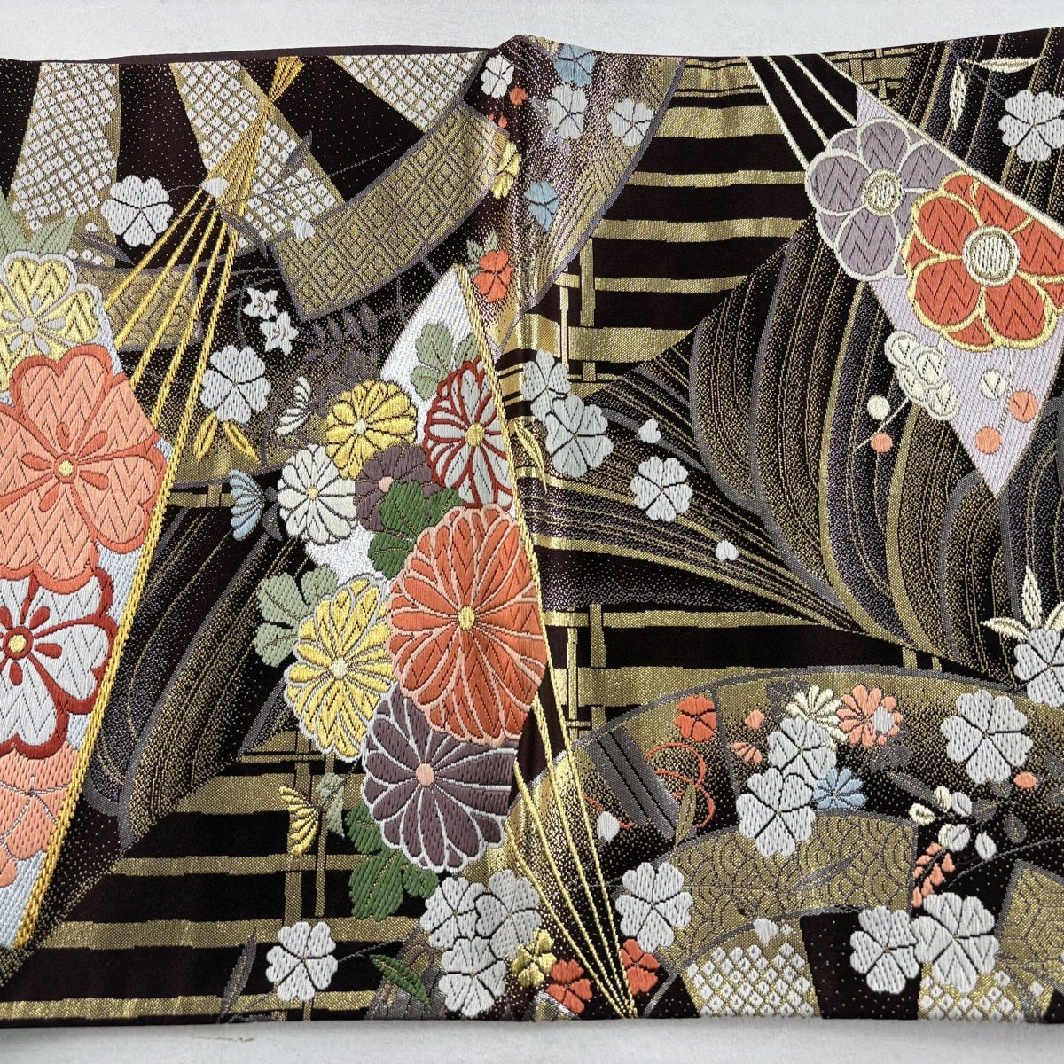 【美品】 袋帯 秀品 桜 流水 金銀糸 箔 黒 六通 正絹