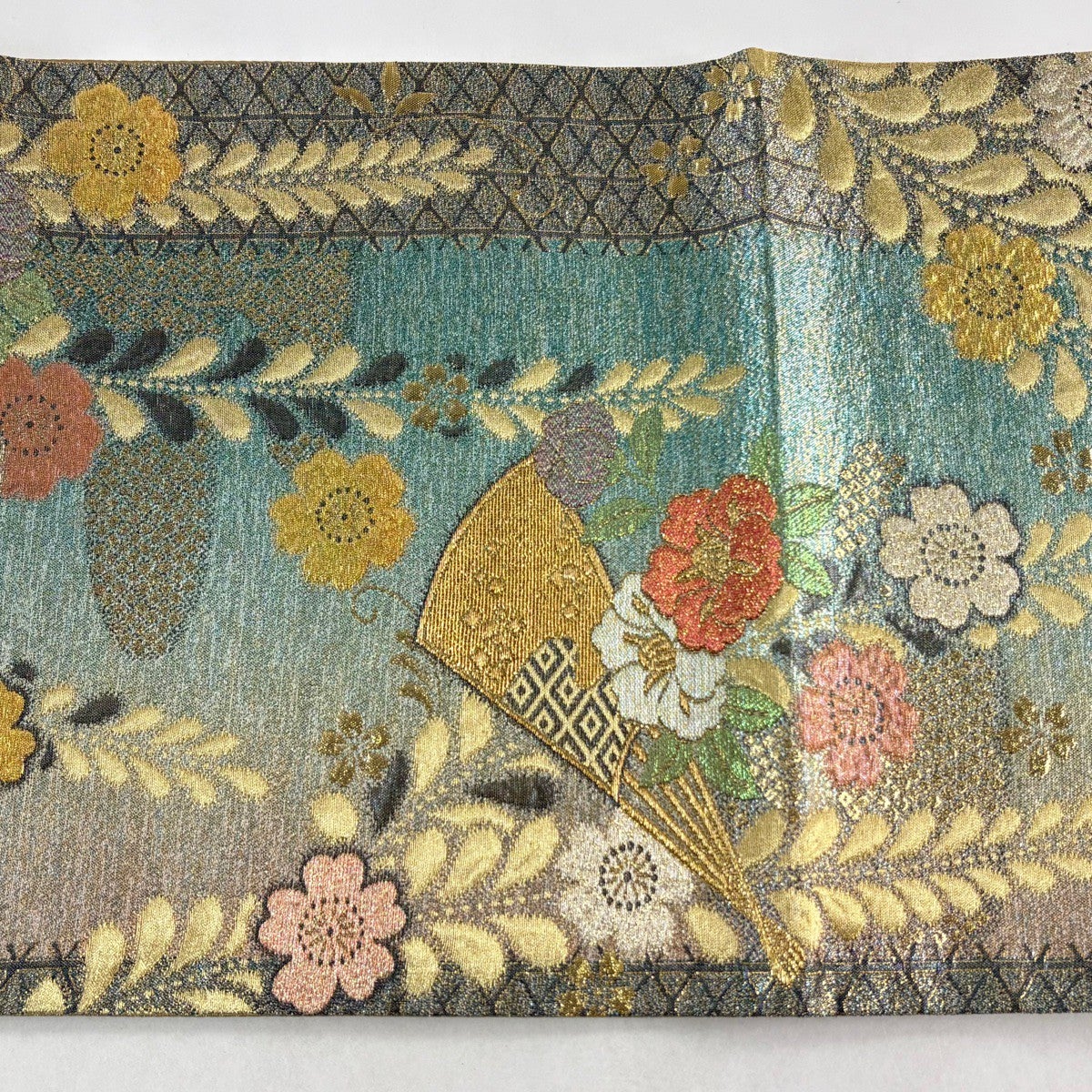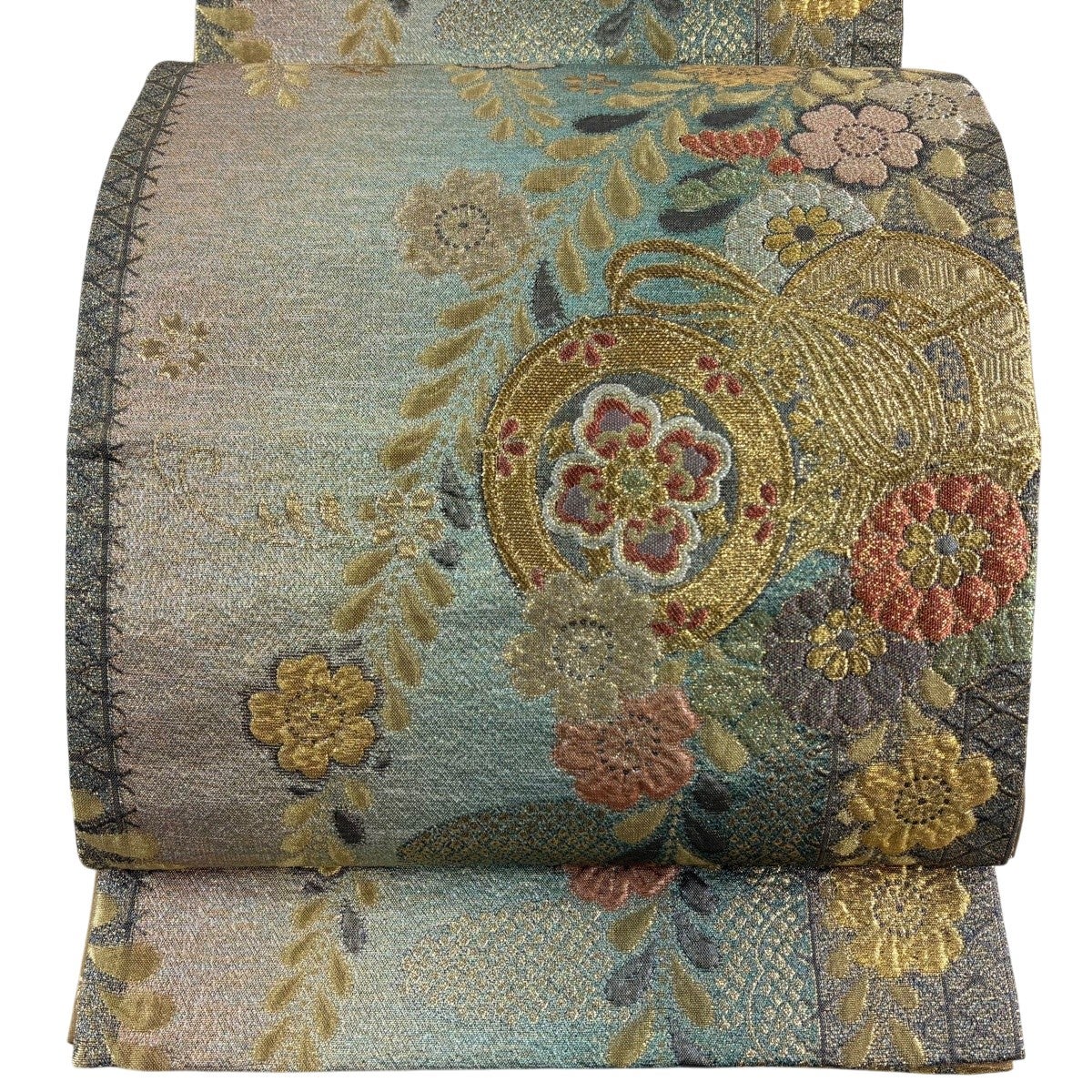 【美品】 袋帯 秀品 草花 金糸 金彩 灰緑 お太鼓柄 正絹