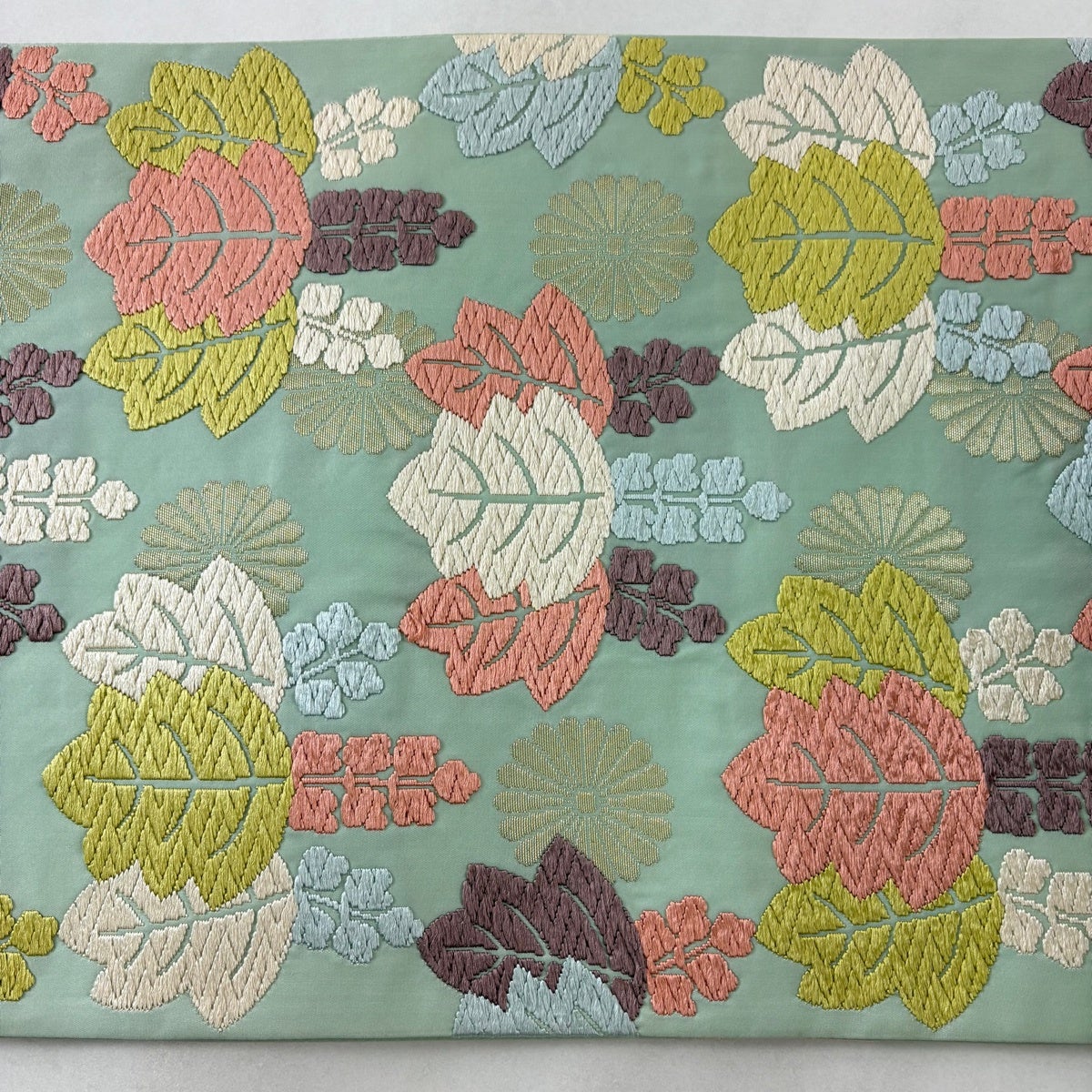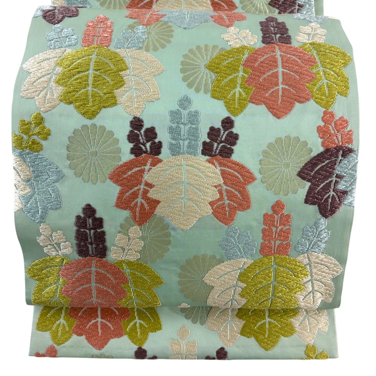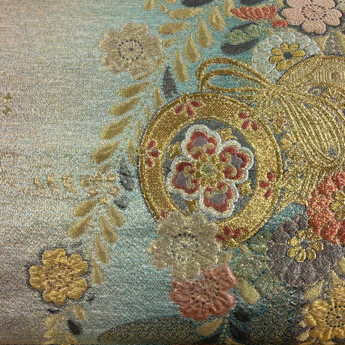 【美品】 袋帯 名品 草花 波 金糸 箔 水色 六通 正絹