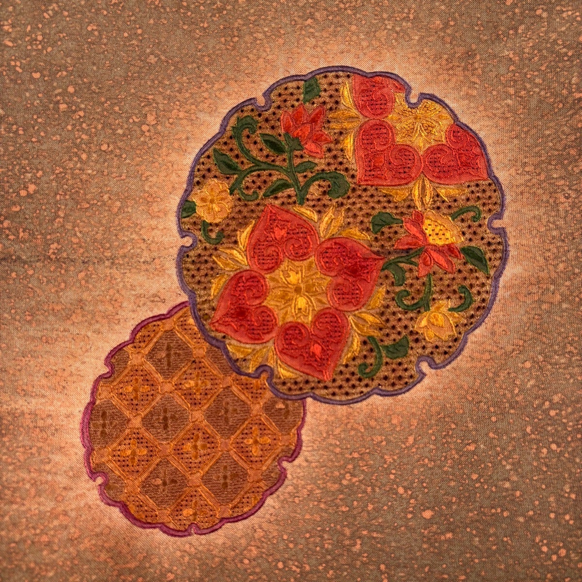 袋帯 秀品 辻が花柄 菱 金糸 箔 黄土色 お太鼓柄 正絹