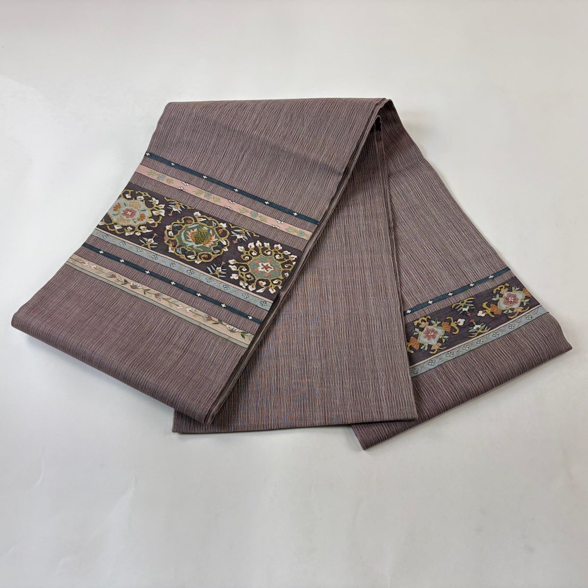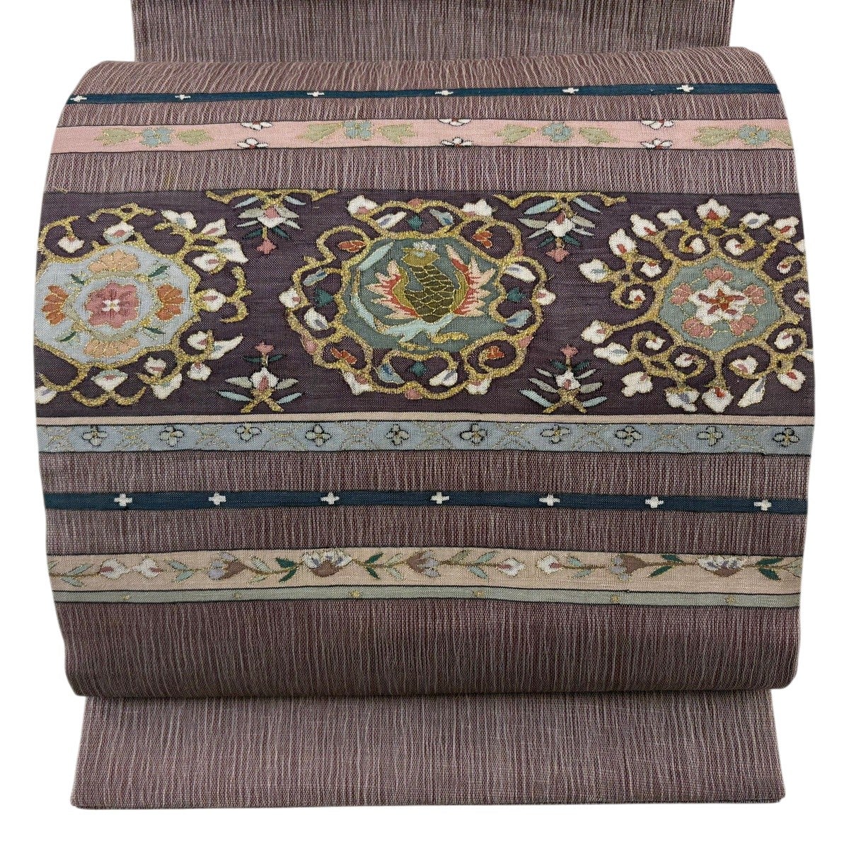 袋帯 秀品 夏帯 枝花 波 金銀糸 茶紫 お太鼓柄 正絹