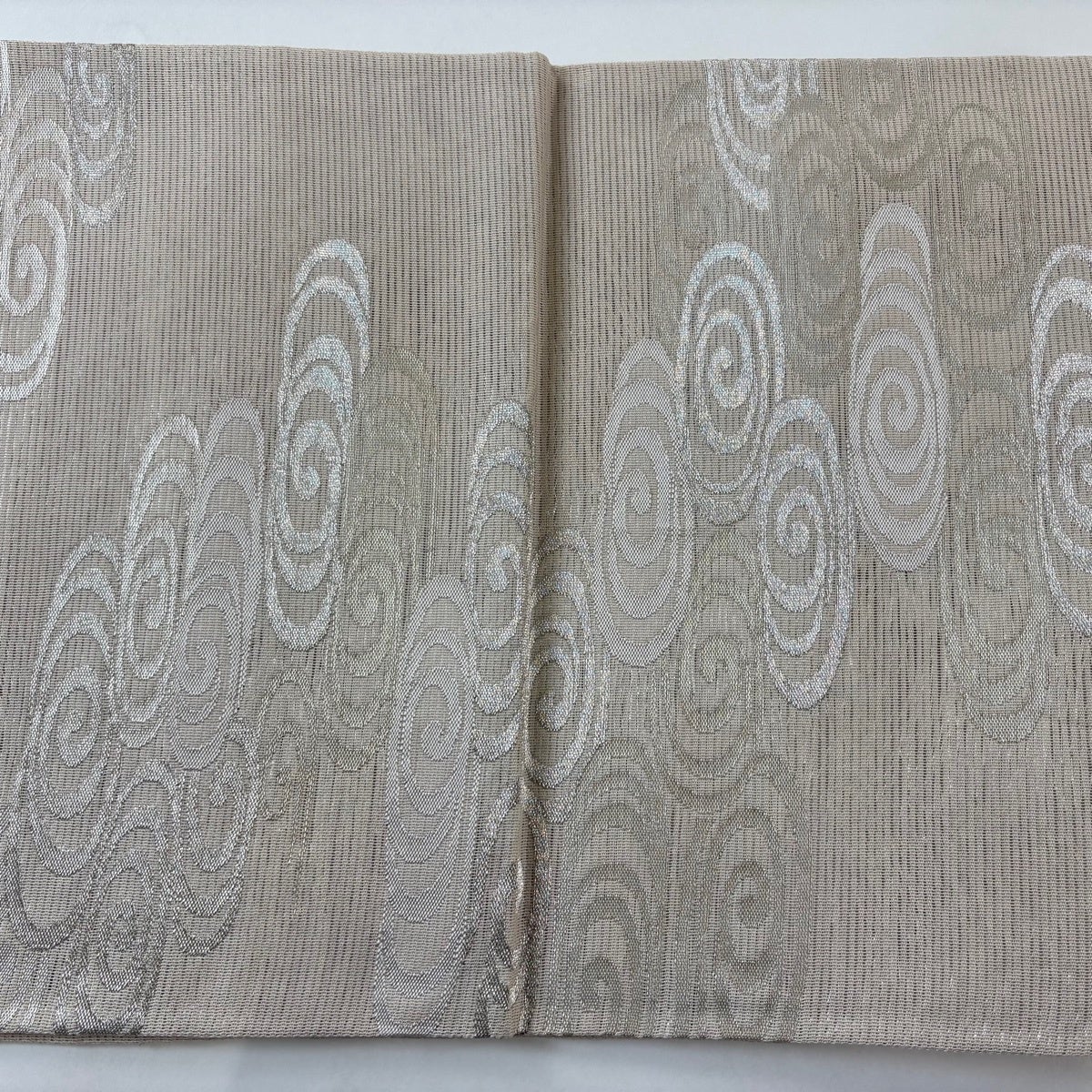 袋帯 秀品 夏帯 縞 幾何学 銀糸 クリーム 六通 正絹