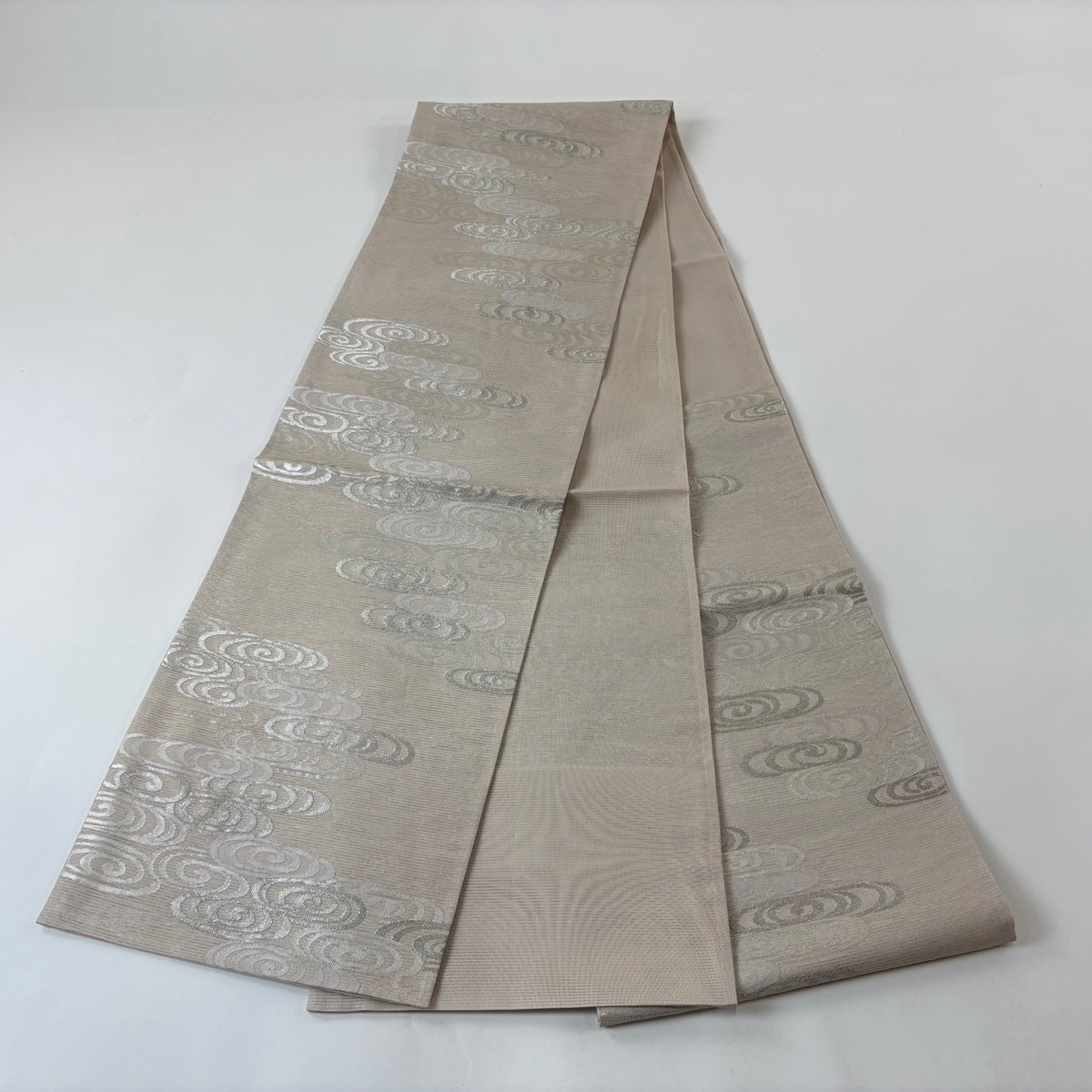 袋帯 秀品 夏帯 波 銀糸 ベージュ お太鼓柄 正絹