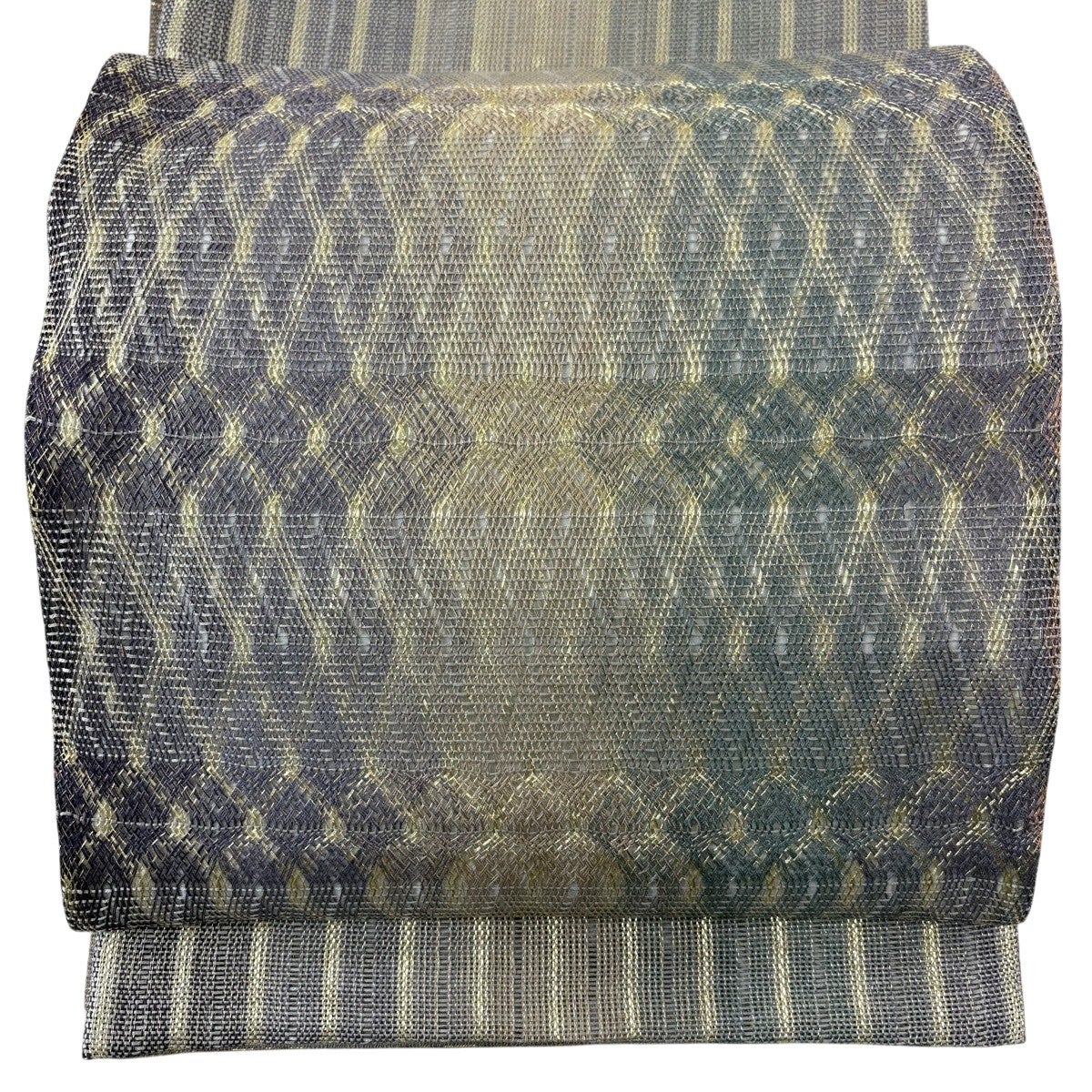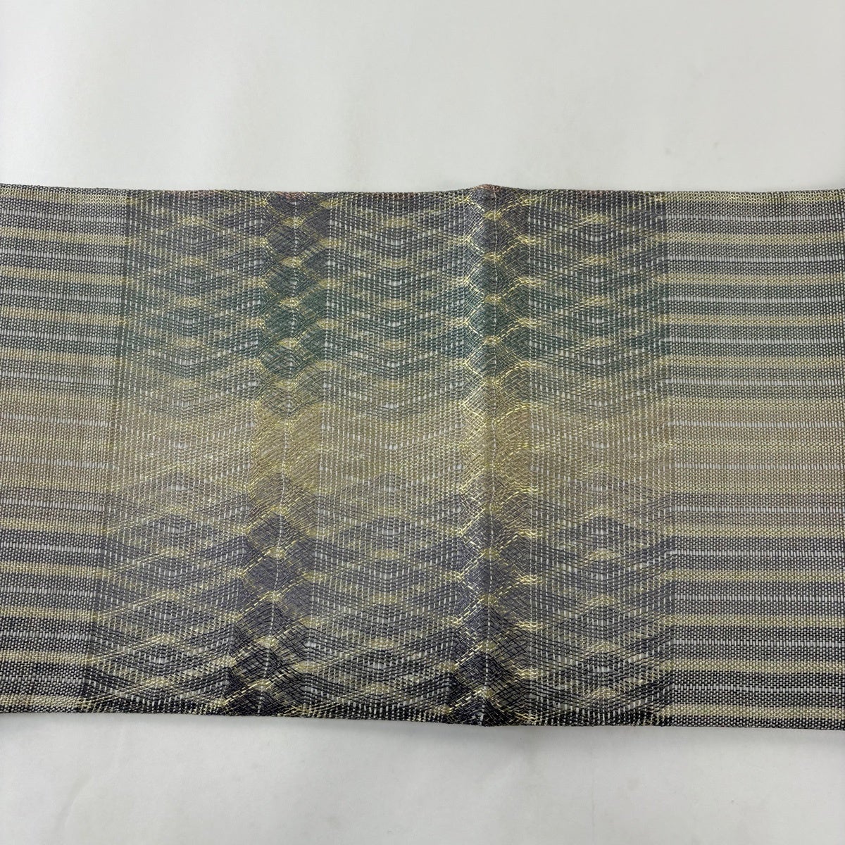 袋帯 秀品 夏帯 菱 幾何学 金糸 茶緑色 お太鼓柄 正絹