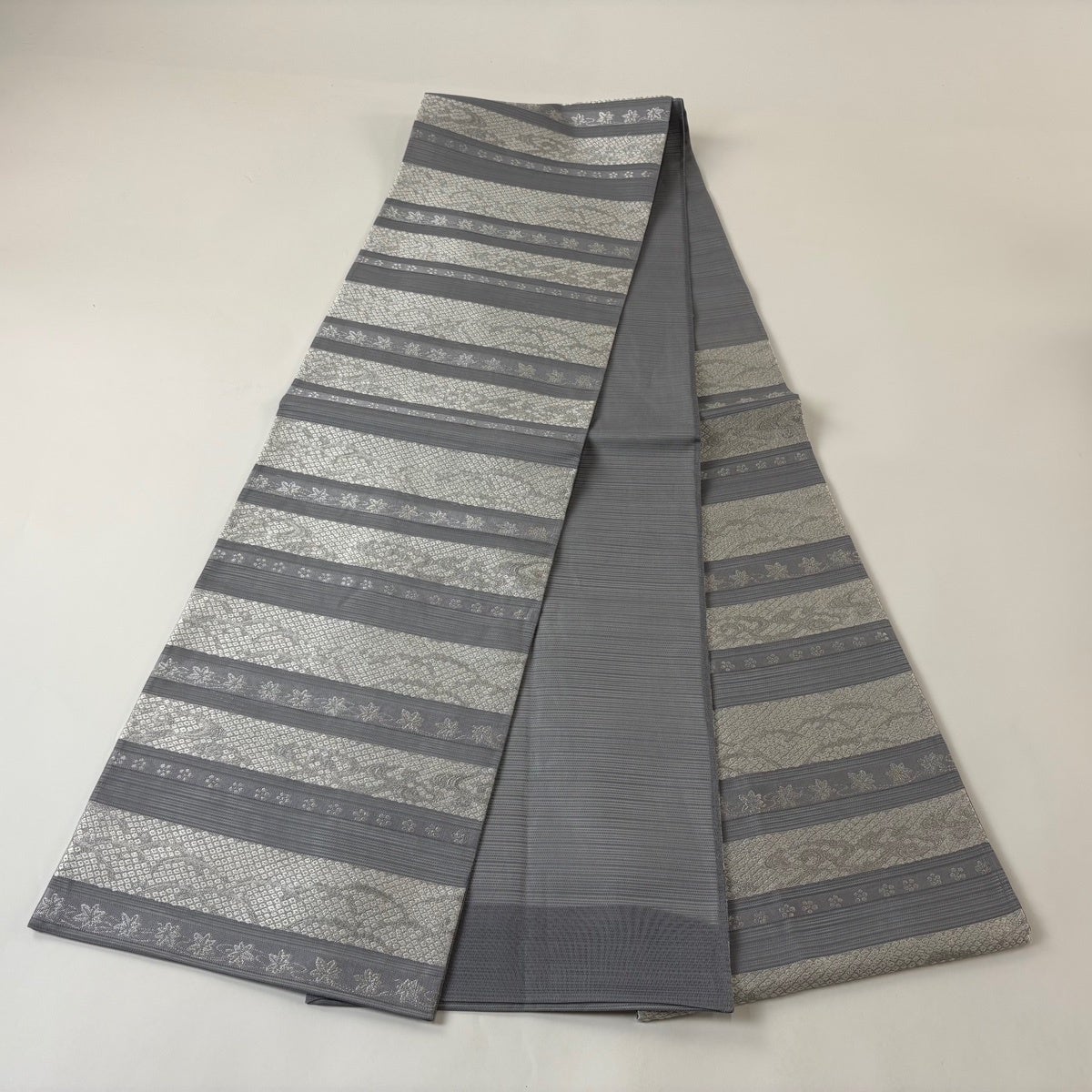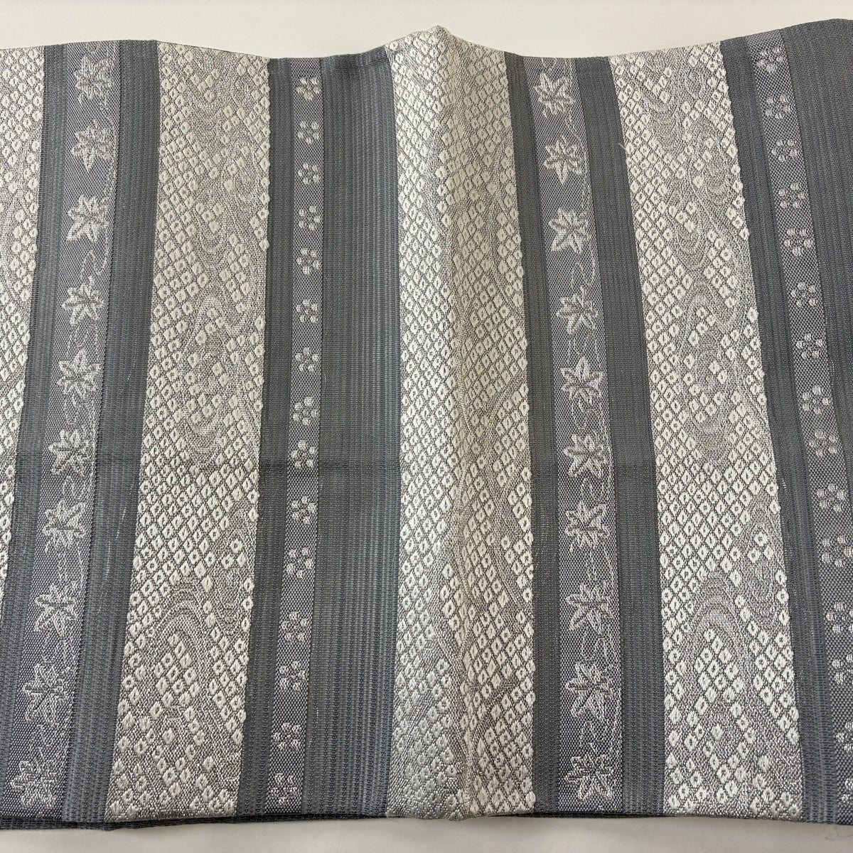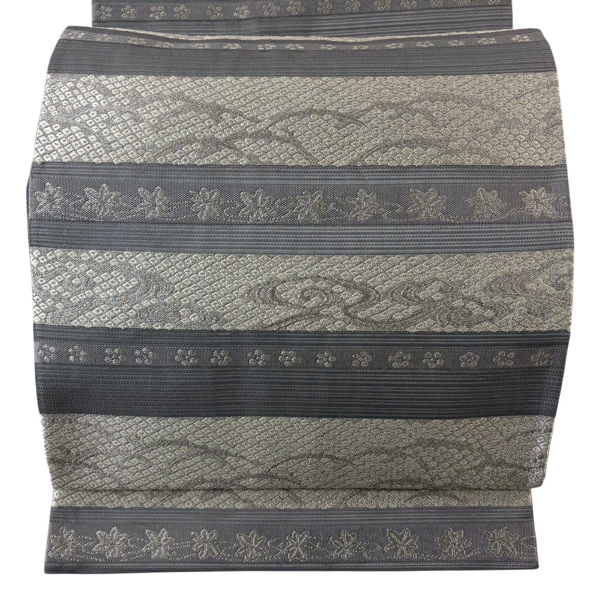 【美品】 袋帯 秀品 夏帯 芝 流水 銀糸 灰色 六通 正絹