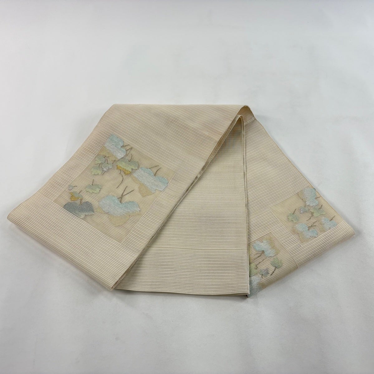 【美品】 袋帯 秀品 夏帯 樹木 山並み ベージュ お太鼓柄 正絹