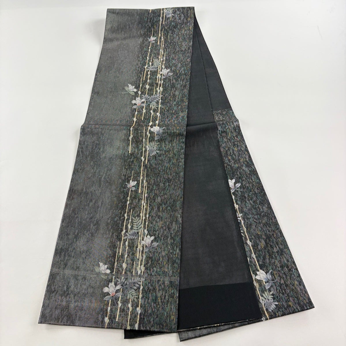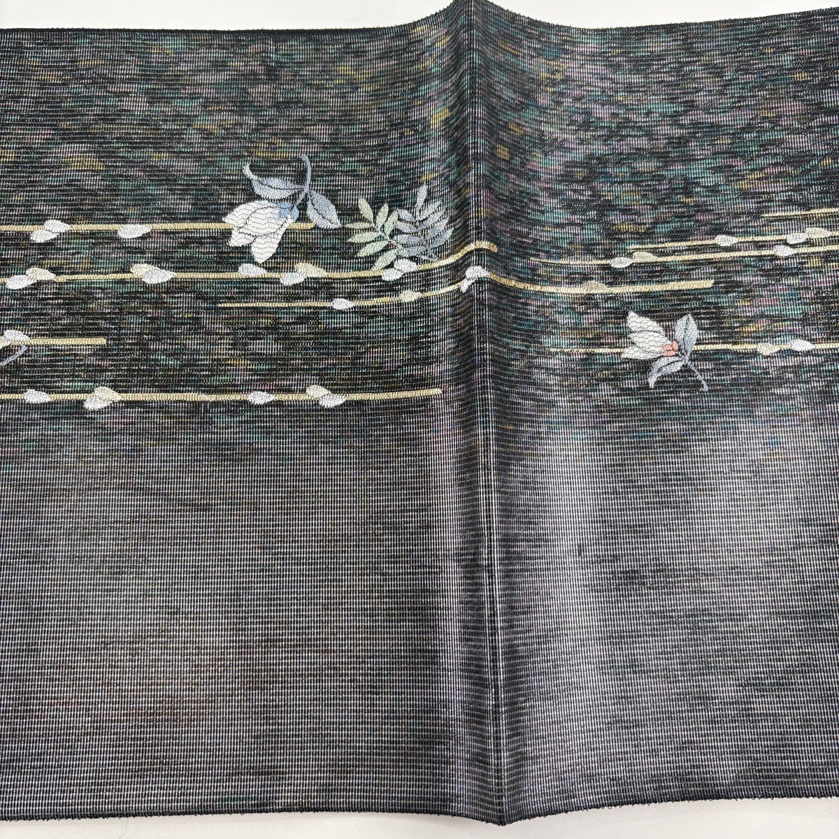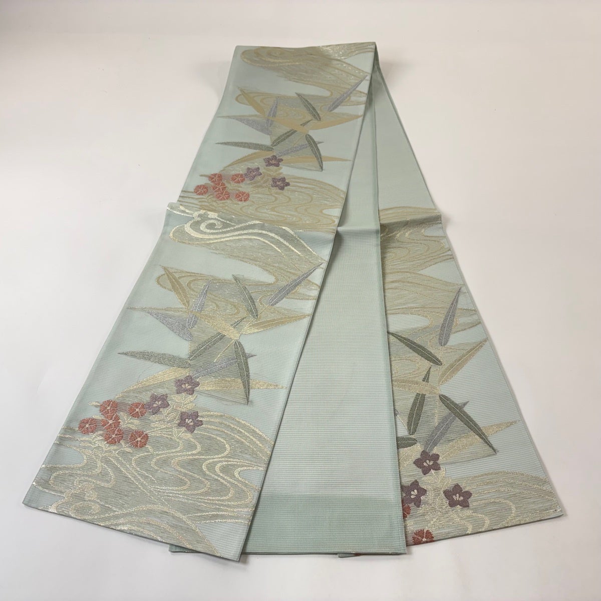【美品】 袋帯 秀品 夏帯 絽 草花 流水 箔 金銀糸 灰緑 六通 正絹