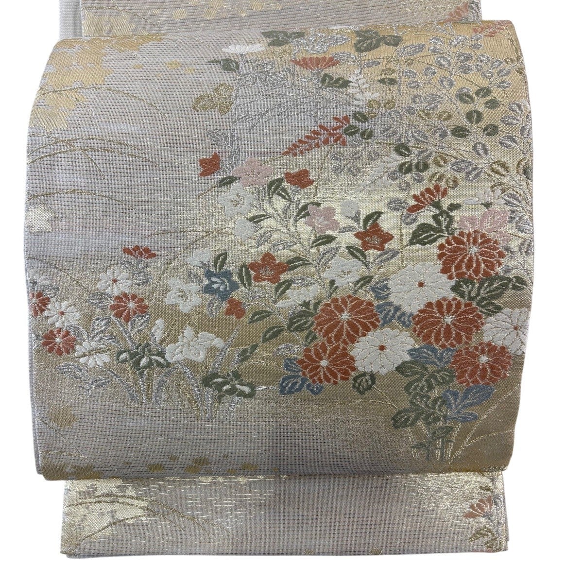【美品】 袋帯 秀品 夏帯 草花 ヱ霞 金銀糸 クリーム お太鼓柄 正絹